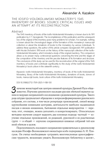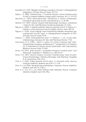 22. Плигузов А. И. Новые материалы к истории Волоколамской библиотеки: неизвестная опись монастырских книг 1857 года // Археографический ежегодник за 2014-2015 годы. М.: Наука, 2023. С. 18-38.