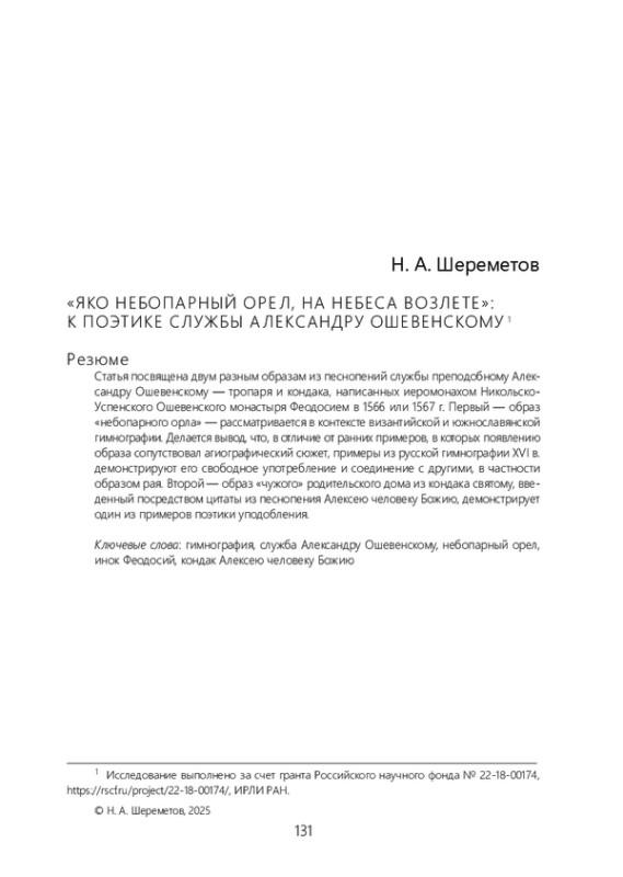 41. Шереметов Н. А. Служба преподобному Александру Ошевенскому: к истории текста // Русская агиография: Исследования. Материалы. Публикации. СПб.: Изд-во “Пушкинский Дом”, 2024. Т. 5. С. 119-165. EDN: KIZJLQ