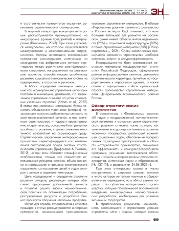 Цель исследования – определить стратегии развития акторов «зеленой» интеграции, реализация которых обеспечивает приращение добавленной ценности и способствует решению задач научно-технической политики по оптимизации потребления, распределению ресурсов и разработке бизнес-процессов для производства «зеленых» продуктов. Анализ ресурсного подхода к управлению интеграцией позволил установить, что его ключевыми концепциями являются «зеленый» продукт и ментальная зрелость. Реализацию этих концепций предлагается рассматривать в качестве одного из критериев для идентификации стратегий развития предприятий, реализующих эко-проекты. В статье применены методы сценарного моделирования для определения возможных стратегий развития участников интеграционных процессов. Предложены шесть типов стратегий развития акторов на основе объединения инновационных и конкурентных стратегий. «Зеленая» добавленная ценность рассматривается как стратегический ориентир, а показателем эффективности стратегирования служит приращение ценности. С этих позиций для каждой роли акторов обоснованы стратегии акторов в отрасли производства строительных материалов Центрального экономического района России. Результаты исследования могут быть применимы при сценарном моделировании для разработки региональных и отраслевых стратегий развития.
