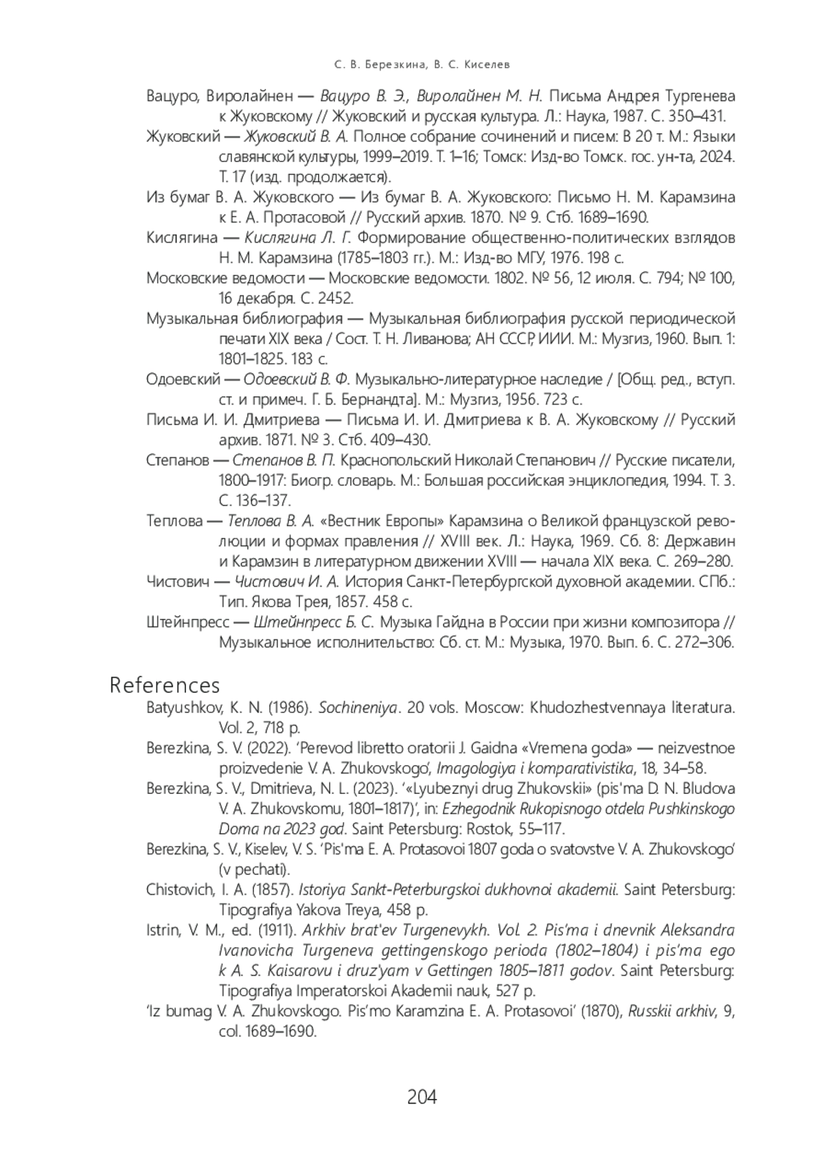 3. Березкина С. В. Перевод либретто оратории Й. Гайдна “Времена года” - неизвестное произведение В. А. Жуковского // Имагология и компаративистика. 2022. № 18. С. 34-58. EDN: OBJZWW