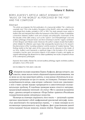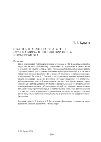 Статья сопровождает публикацию рукописи Б. В. Асафьева «Фет в слуховом восприятии мира»: она вводит в проблематику, поднимаемую исследователем в данном тексте, и осмысляет ее в русле «истории идей». Устанавливается связь публикуемой работы с гуманитарными и философскими течениями первых десятилетий ХХ в., в частности парадигмой «слуховой филологии» (Э. Сиверс, Б. М. Эйхенбаум) и «органическим мировоззрением» (А. Бергсон, Н. О. Лосский), а также сквозными темами в научном поиске самого музыковеда: изучением феномена «звучащего вещества» и многолетними наблюдениями над природой музыкально-творческого слуха. Делается вывод о несомненной ценности представленного текста в наследии Асафьева и о его актуальности для современного читателя: работа отражает важный этап в формировании исследовательской концепции музыковеда, в ней затрагиваются необычные ракурсы анализа поэтического текста и применяется оригинальная методология, которая позволила автору получить качественно новые результаты в сравнении с его современникамифилологами.