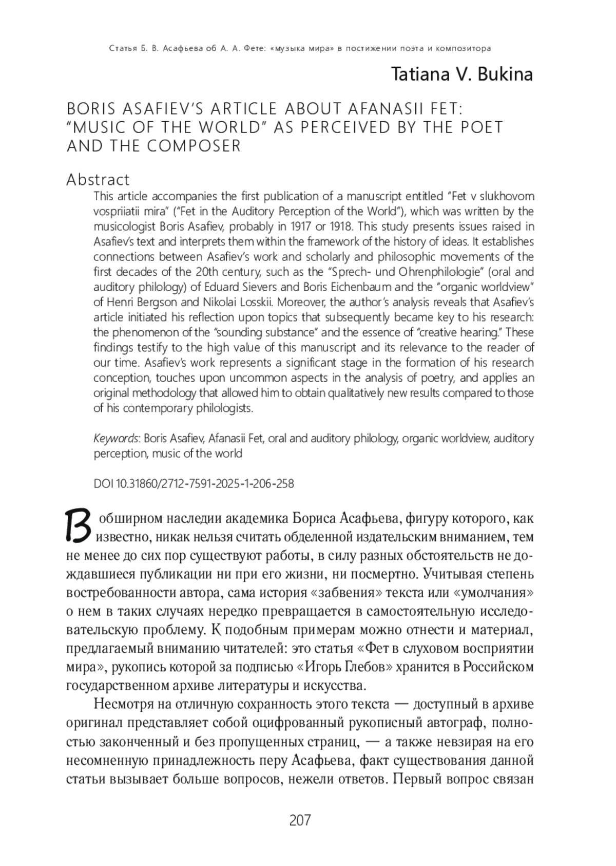 В обширном наследии академика Бориса Асафьева, фигуру которого, как известно, никак нельзя считать обделенной издательским вниманием, тем не менее до сих пор существуют работы, в силу разных обстоятельств не дождавшиеся публикации ни при его жизни, ни посмертно. Учитывая степень востребованности автора, сама история «забвения» текста или «умолчания» о нем в таких случаях нередко превращается в самостоятельную исследовательскую проблему. К подобным примерам можно отнести и материал, предлагаемый вниманию читателей: это статья «Фет в слуховом восприятии мира», рукопись которой за подписью «Игорь Глебов» хранится в Российском государственном архиве литературы и искусства.