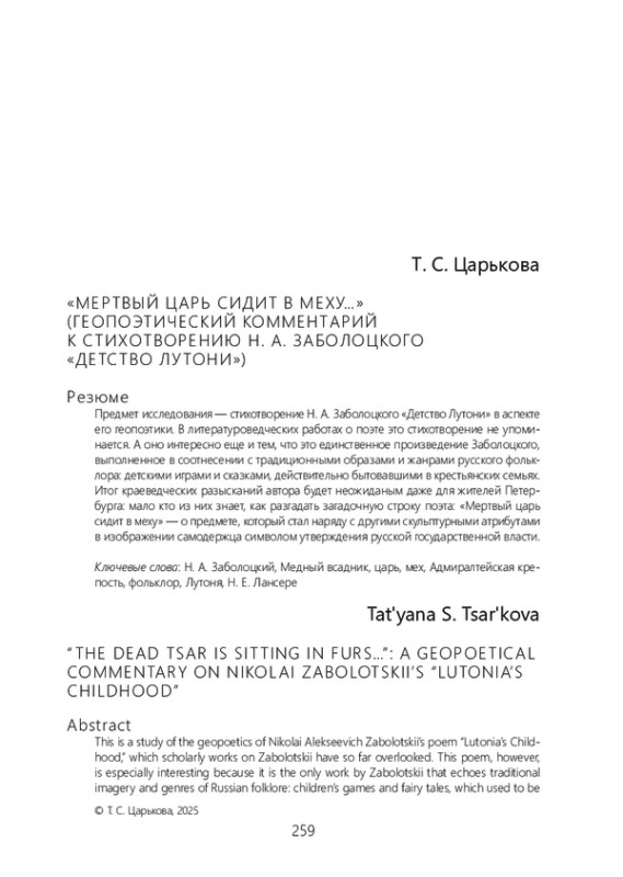 Предмет исследования — стихотворение Н. А. Заболоцкого «Детство Лутони» в аспекте его геопоэтики. В литературоведческих работах о поэте это стихотворение не упоминается. А оно интересно еще и тем, что это единственное произведение Заболоцкого, выполненное в соотнесении с традиционными образами и жанрами русского фольклора: детскими играми и сказками, действительно бытовавшими в крестьянских семьях. Итог краеведческих разысканий автора будет неожиданым даже для жителей Петербурга: мало кто из них знает, как разгадать загадочную строку поэта: «Мертвый царь сидит в меху» — о предмете, который стал наряду с другими скульптурными атрибутами в изображении самодержца символом утверждения русской государственной власти.