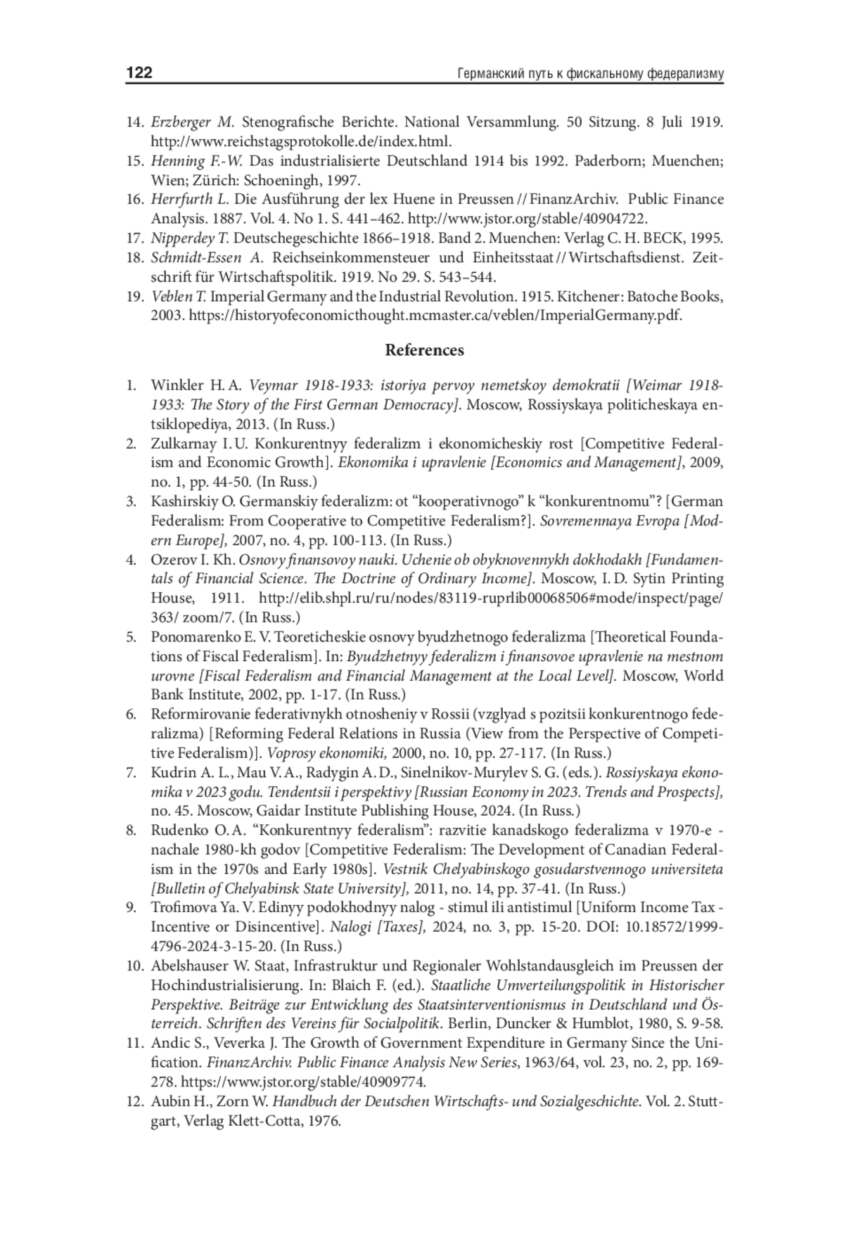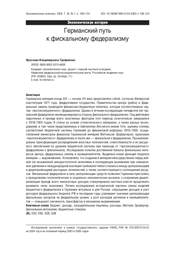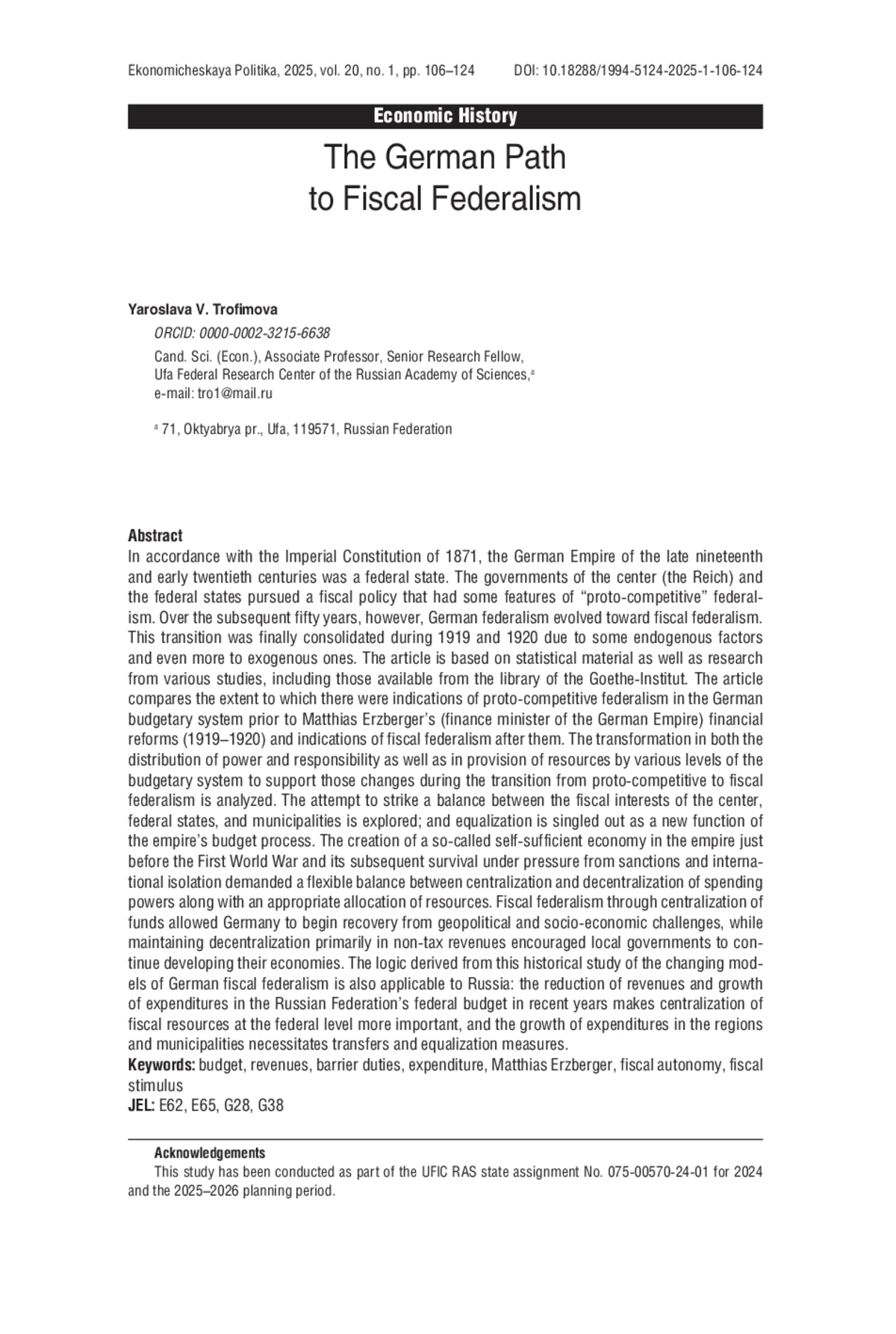 ТРОФИМОВА Я. В. ГЕРМАНСКИЙ ПУТЬ К ФИСКАЛЬНОМУ ФЕДЕРАЛИЗМУ // ЭКОНОМИЧЕСКАЯ ПОЛИТИКА. 2025. ТОМ 20, № 1