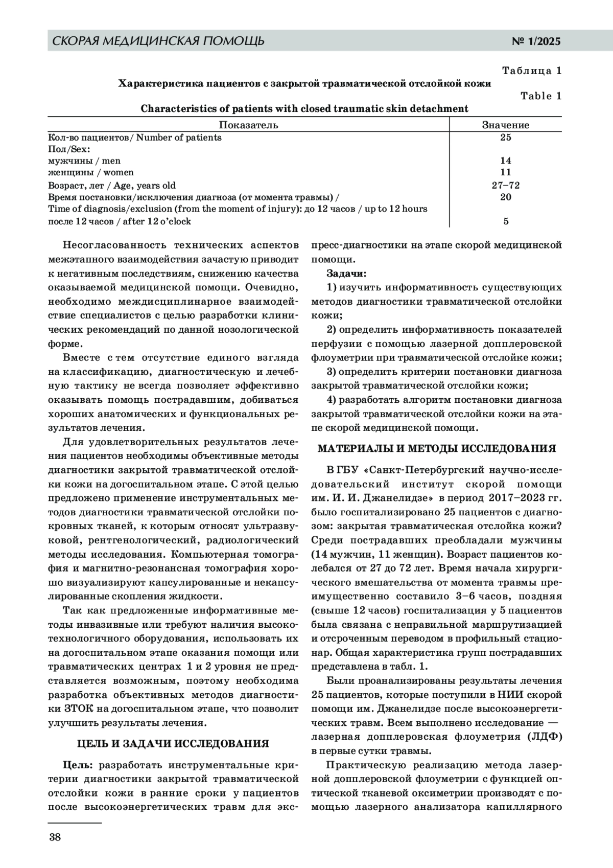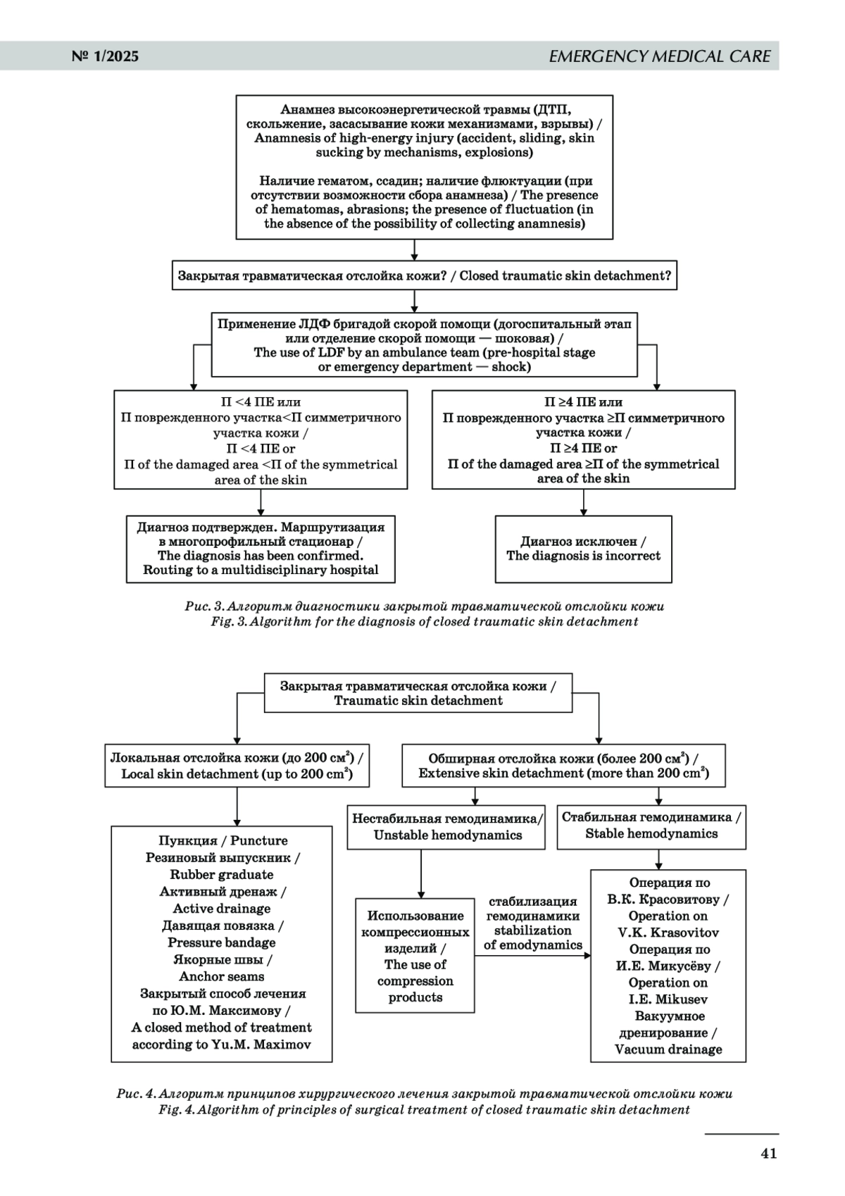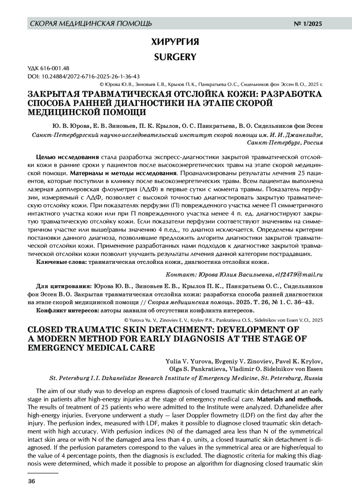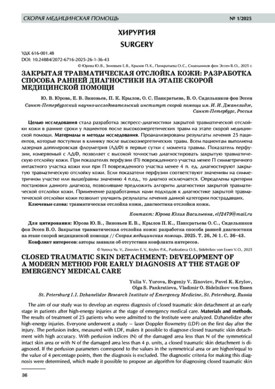 Целью исследования стала разработка экспресс-диагностики закрытой травматической отслойки кожи в ранние сроки у пациентов после высокоэнергетических травм на этапе скорой медицинской помощи. Материалы и методы исследования. Проанализированы результаты лечения 25 пациентов, которые поступили в клинику после высокоэнергетических травм. Всем пациентам выполнена лазерная допплеровская флоуметрия (ЛДФ) в первые сутки с момента травмы. Показатель перфузии, измеряемый с ЛДФ, позволяет с высокой точностью диагностировать закрытую травматическую отслойку кожи. При показателях перфузии (П) поврежденного участка менее П симметричного интактного участка кожи или при П поврежденного участка менее 4 п. ед. диагностируют закрытую травматическую отслойку кожи. Если показатели перфузии соответствуют значениям на симметричном участке или выше/равны значению 4 п. ед., то диагноз исключается. Определены критерии постановки данного диагноза, позволившие предложить алгоритм диагностики закрытой травматической отслойки кожи. Применение разработанных нами подходов к диагностике закрытой травматической отслойки кожи позволит улучшить результаты лечения данной категории пострадавших.