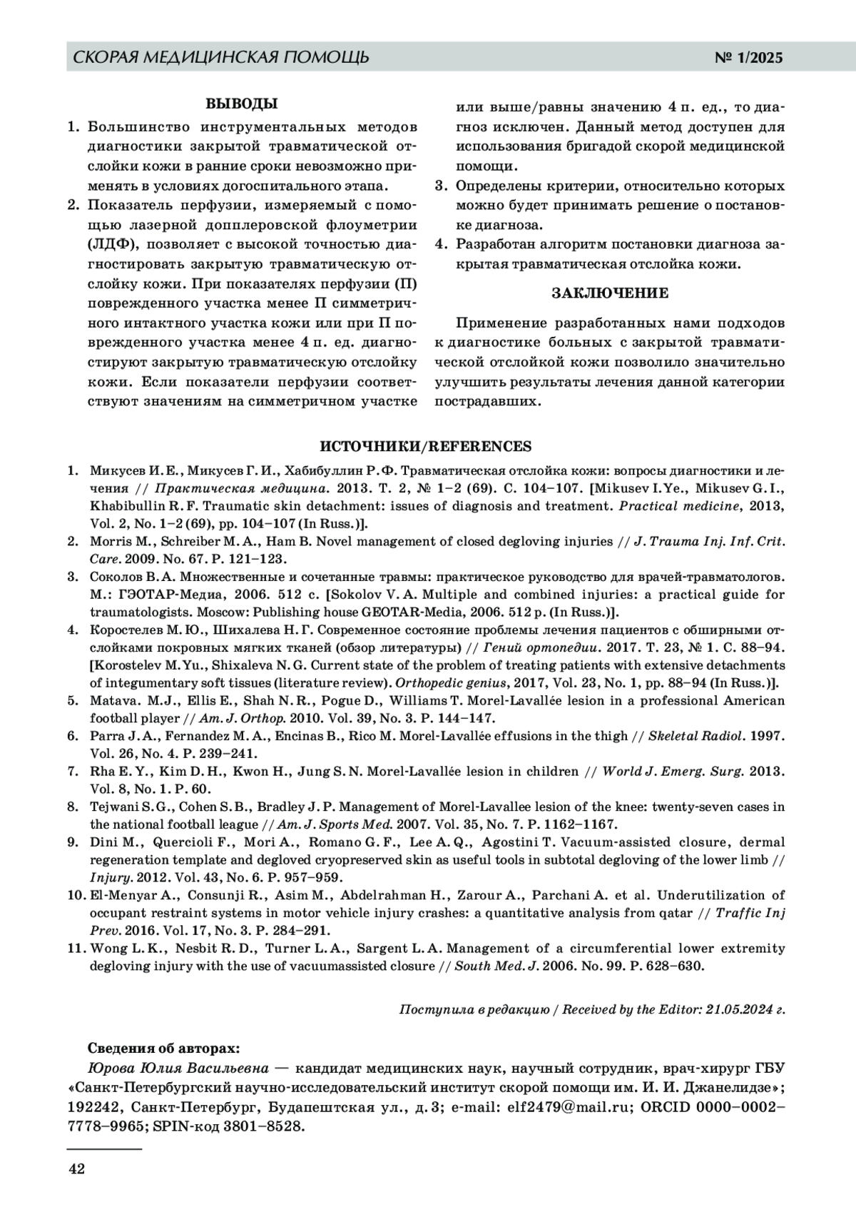 2. 	Morris M., Schreiber M. A., Ham B. Novel management of closed degloving injuries // J. Trauma Inj. Inf. Crit. Care. 2009. No. 67. P. 121-123.