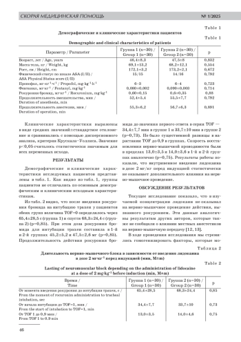 Использование лидокаина в схеме в мультимодальной анестезии с целью снижения доз анестетиков по сравнению с классическим обезболиванием — перспективное направление современной анестезиологии. Широкое применение в анестезиологической практике местных анестетиков позволило выявить их существенное влияние на нейромышечный профиль. Однако имеющиеся исследования по изучению комбинаций этих препаратов с мышечными релаксантами носят весьма разноречивый характер. Цель исследования: изучить влияния предоперационного внутривенного введения лидокаина на нервно-мышечную проводимость. Материалы и методы исследования. С целью оценки влияния лидокаина на нервно-мышечную проводимость обследовано 60 пациентов (ASA I–II), которым была проведена лапароскопическая холецистэктомия по поводу хронического калькулезного холецистита. Были сформированы две группы пациентов: принимавшие лидокаин в дозе 2 мг·кг‑1 (30 человек, группа 1) и те, кто использовал 0,9% раствор натрия хлорида (физиологический раствор) (30 человек, группа 2). Нервно-мышечную проводимость оценивали с помощью метода акцелеромиографии (монитор TOF-Watch SX). Результаты. Скорость восстановления нервно-мышечной проводимости были в пределах 47 и 48 мин в 1‑й и 2‑й группах аналогично (р=0,92). Заключение. В результате исследования установлено, что лидокаин статистически не оказывал значимого влияния на нервно-мышечную передачу.