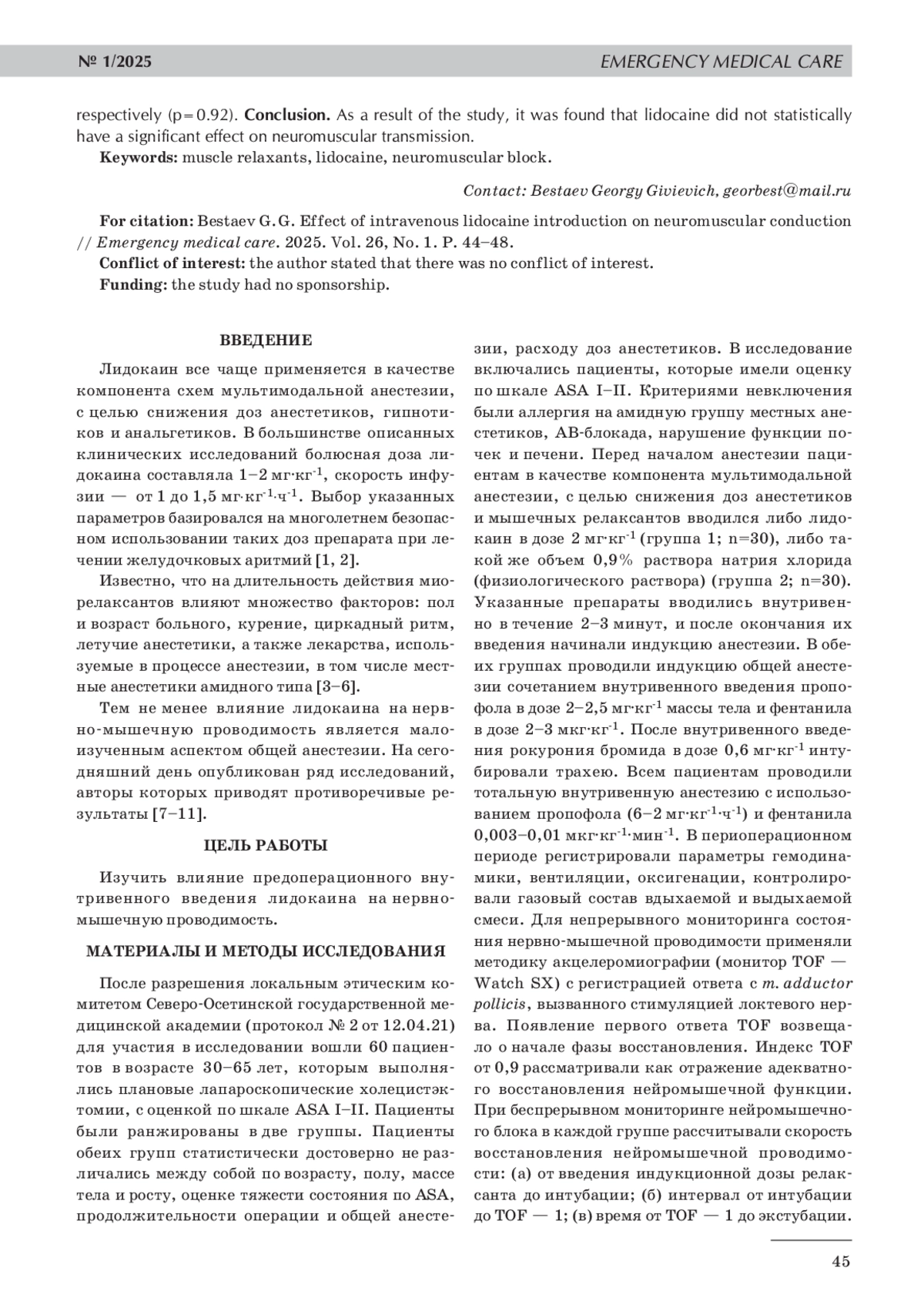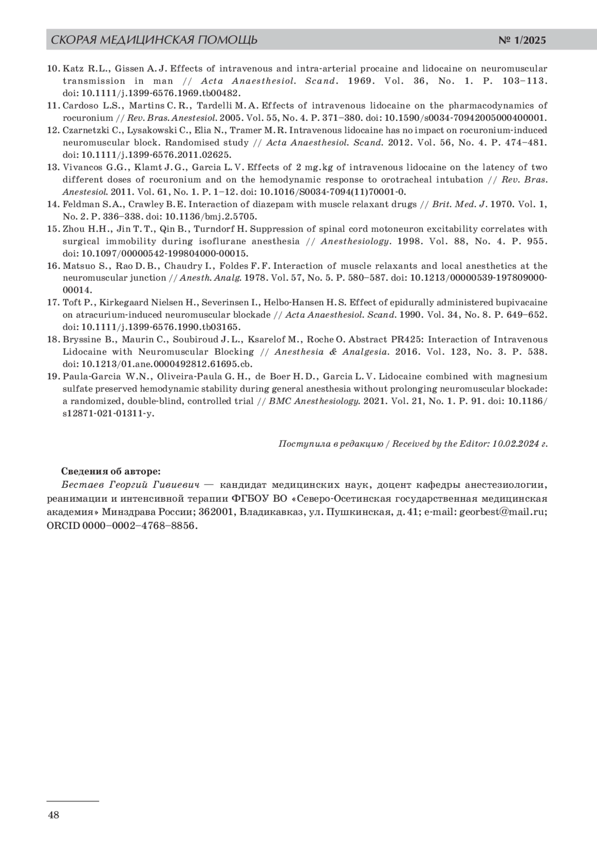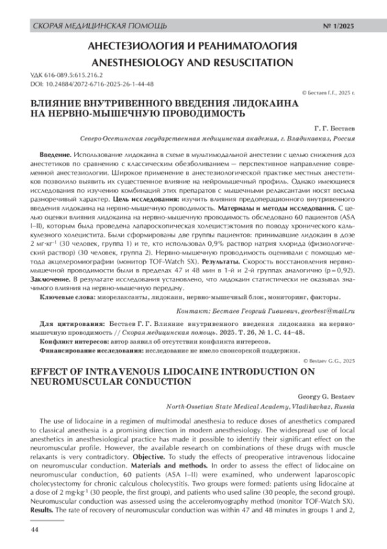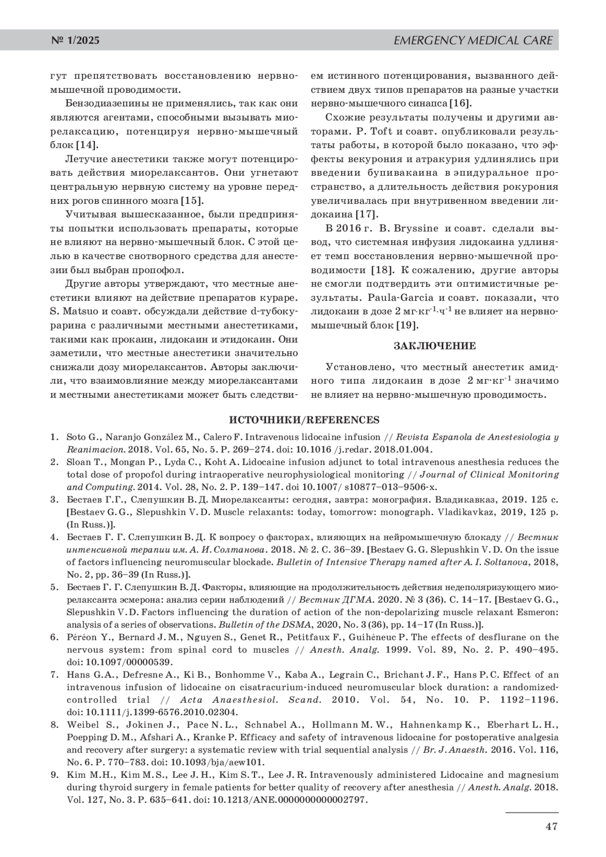 7. 	Hans G.A., Defresne A., Ki B., Bonhomme V., Kaba A., Legrain C., Brichant J. F., Hans P. C. Effect of an intravenous infusion of lidocaine on cisatracurium-induced neuromuscular block duration: a randomized-controlled trial // Acta Anaesthesiol. Scand. 2010. Vol. 54, No. 10. P. 1192-1196. DOI: 10.1111/j.1399-6576.2010.02304