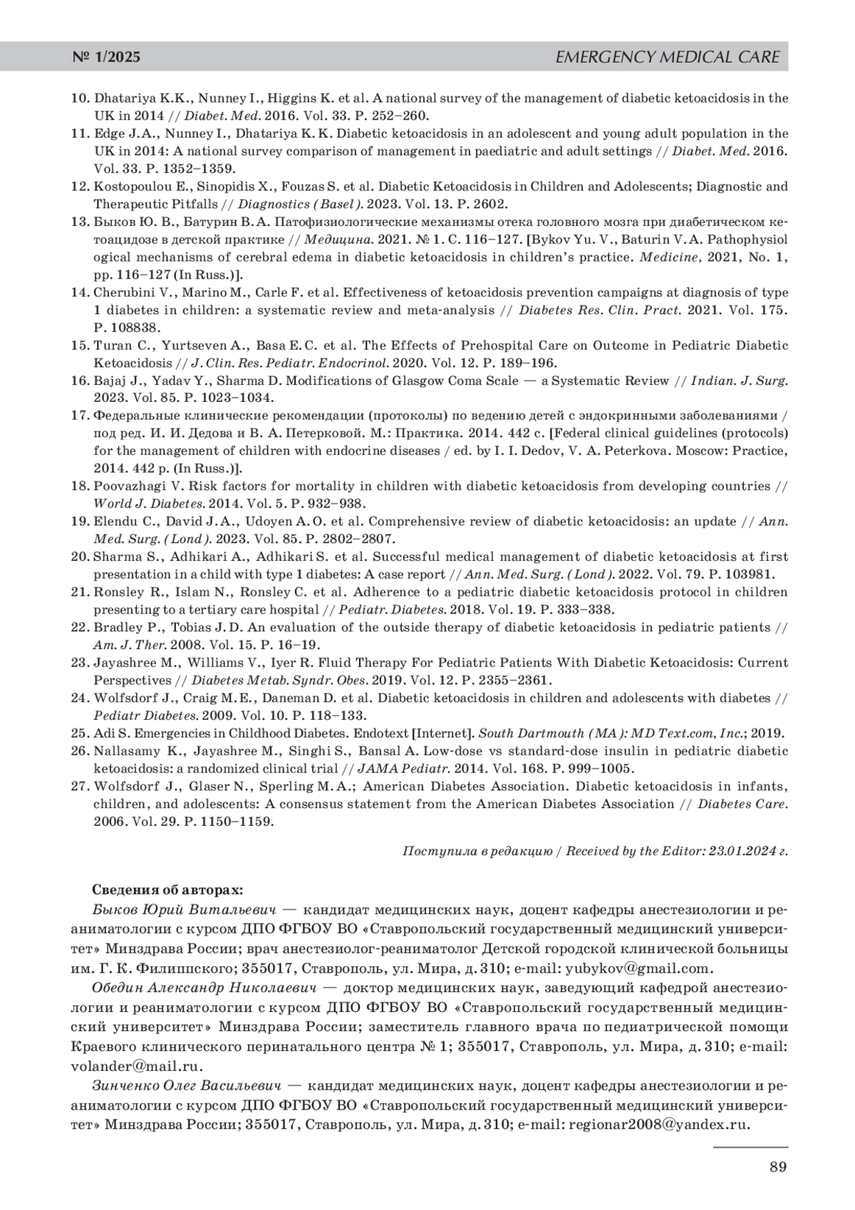 15. 	Turan C., Yurtseven A., Basa E. C. et al. The Effects of Prehospital Care on Outcome in Pediatric Diabetic Ketoacidosis // J. Clin. Res. Pediatr. Endocrinol. 2020. Vol. 12. P. 189-196.