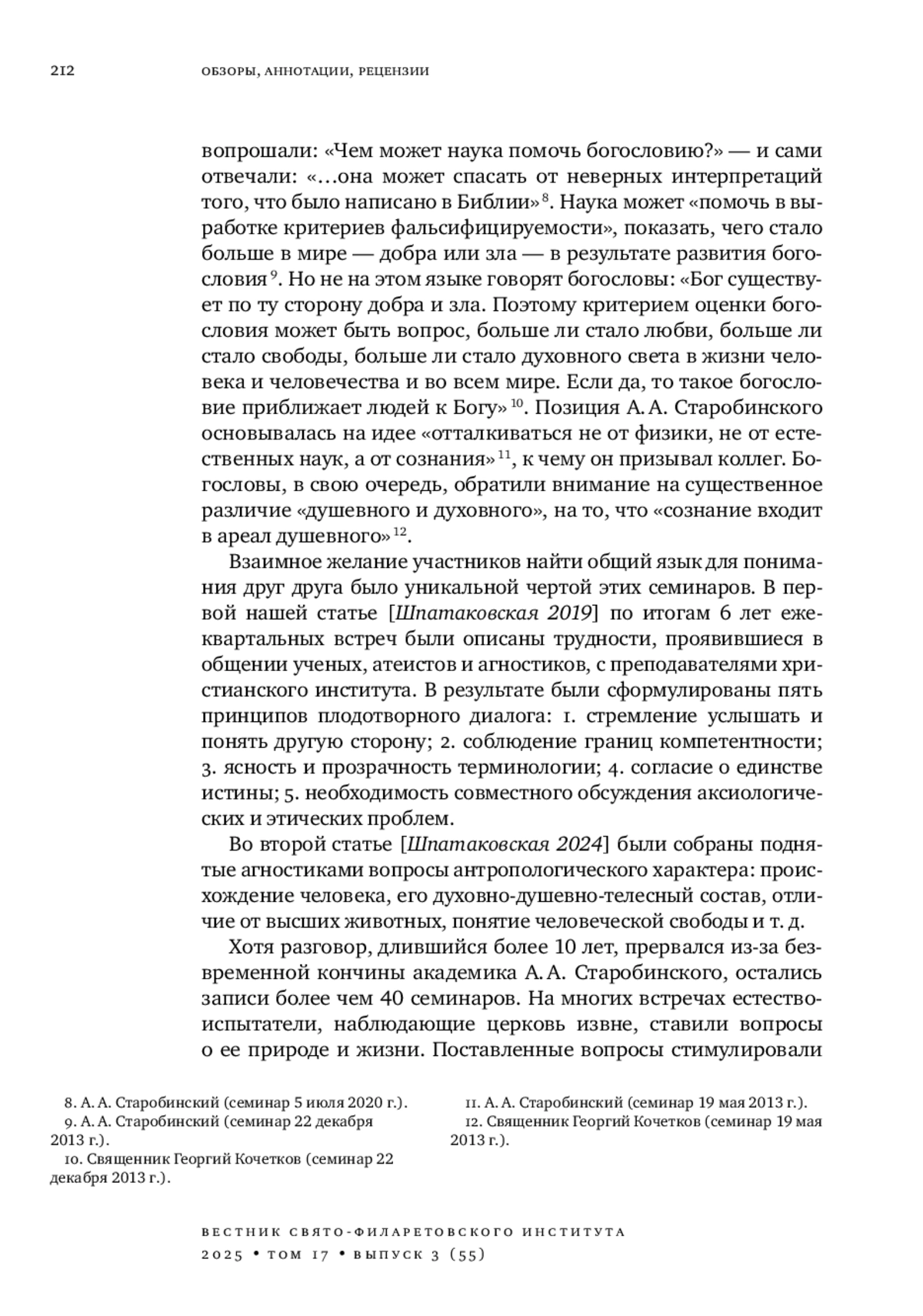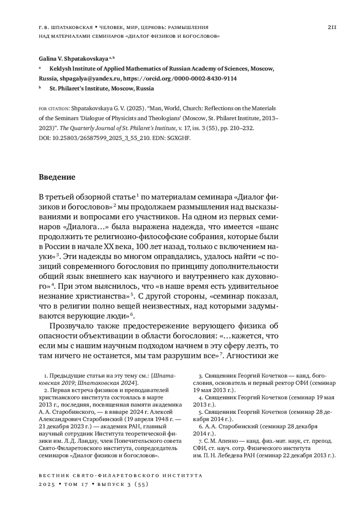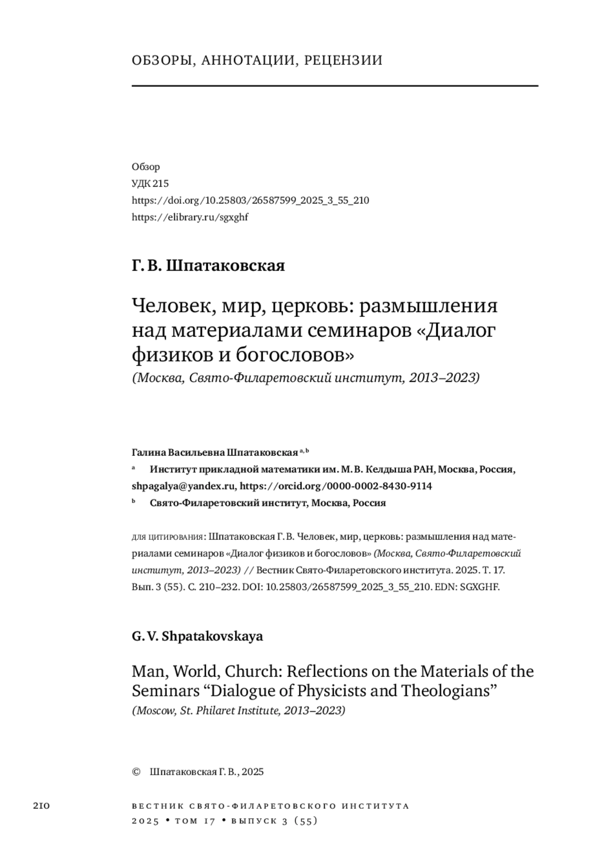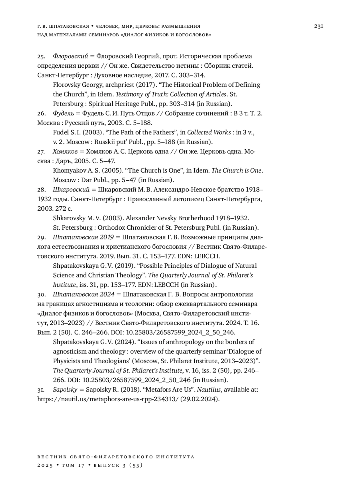 30. Шпатаковская Г. В. Вопросы антропологии на границах агностицизма и теологии: обзор ежеквартального семинара “Диалог физиков и богословов” (Москва, Свято-Филаретовский институт, 2013-2023) // Вестник Свято-Филаретовского института. 2024. Т. 16. Вып. 2 (50). С. 246-266. DOI: 10.25803/26587599_2024_2_50_246