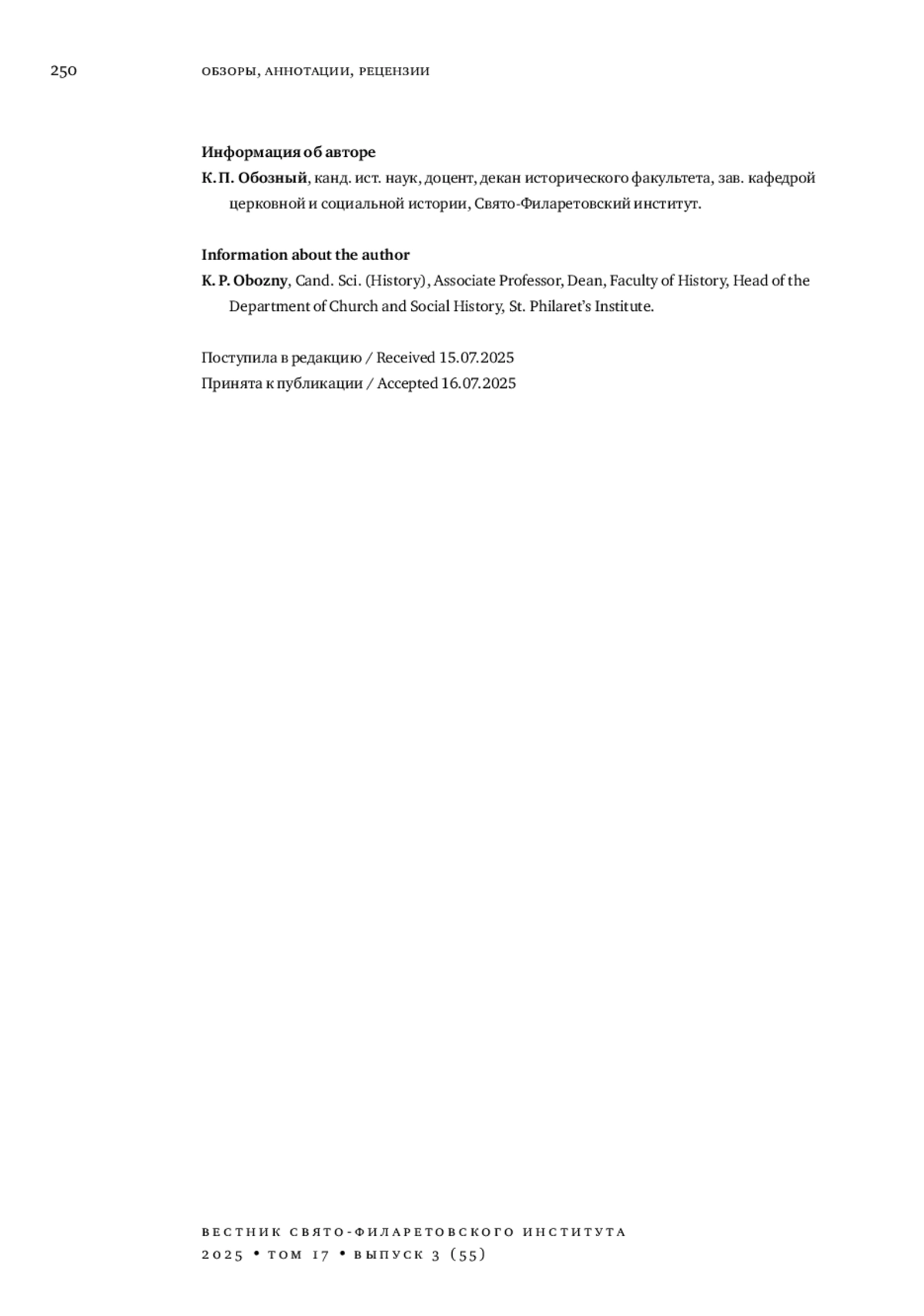 ОБОЗНЫЙ К. П. «ХОТЕЛОСЬ БЫ ВСЕХ ПОИМЕННО НАЗВАТЬ...» РЕЦЕНЗИЯ НА КНИГУ: НУЙКИНА Е. Ю. АРХИВНО-СЛЕДСТВЕННЫЕ ДЕЛА ПО ОБВИНЕНИЮ ДУХОВЕНСТВА РУССКОЙ ПРАВОСЛАВНОЙ ЦЕРКВИ (1917-1930-Е ГГ.): ИСТОЧНИКОВЕДЧЕСКОЕ ИССЛЕДОВАНИЕ. МОСКВА: ИНСТИТУТ СЛАВЯНОВЕДЕНИЯ РАН; САНКТ-ПЕТЕРБУРГ: НЕСТОР-ИСТОРИЯ, 2024. 232 С. // ВЕСТНИК СВЯТО-ФИЛАРЕТОВСКОГО ИНСТИТУТА. 2025. № 3 (55), ТОМ 17