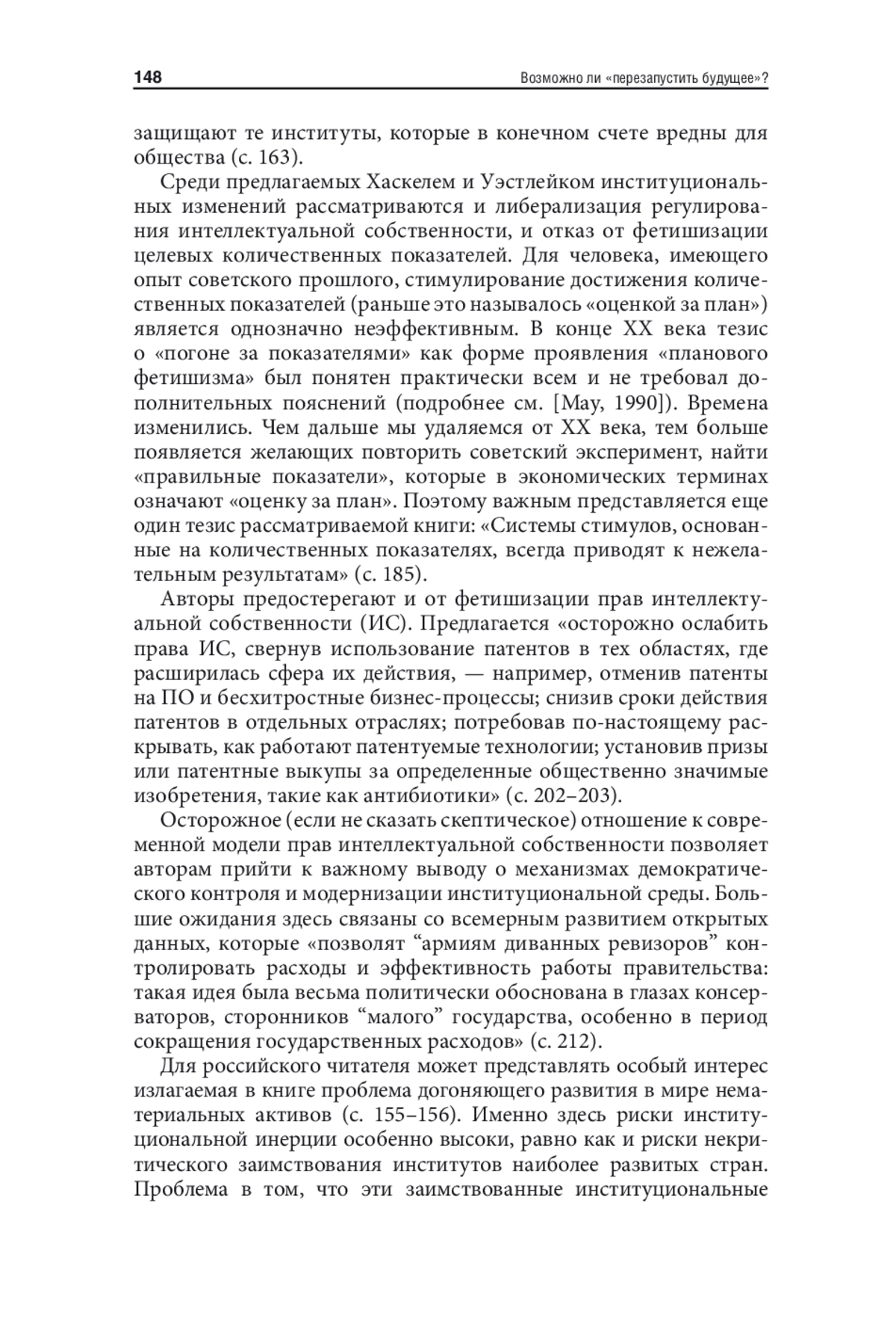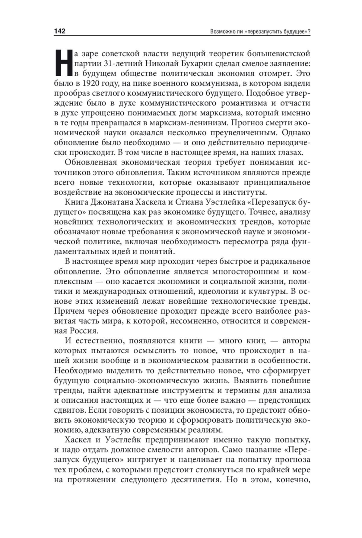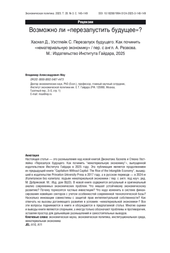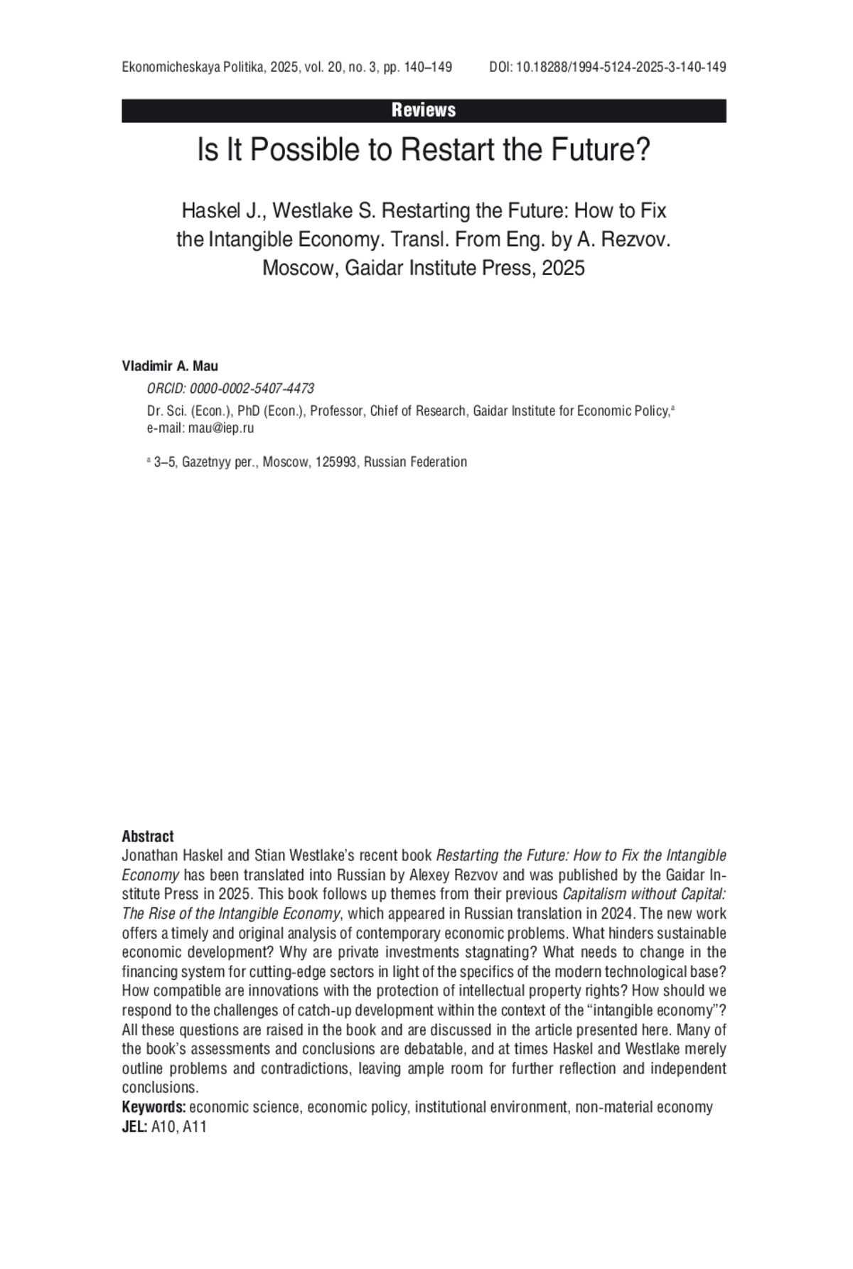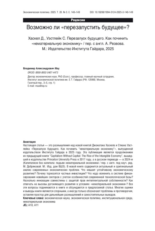 Настоящая статья — это размышления над новой книгой Джонатана Хаскела и Стиана Уэстлейка «Перезапуск будущего. Как починить “нематериальную экономику”», выпущенной издательством Института Гайдара в 2025 году. Эта публикация является продолжением их предыдущей книги “Capitalism Without Capital: The Rise of the Intangible Economy”, вышедшей в издательстве Princeton University Press в 2017 году, а в русском переводе — в 2024-м (Капитализм без капитала: подъем нематериальной экономики / пер. с англ. под науч. ред. М. Добряковой. М.: Изд. дом ВШЭ). В новой книге содержится актуальный и оригинальный анализ современных экономических проблем. Что мешает устойчивому экономическому развитию? Почему тормозятся частные инвестиции? Что надо изменить в системе финансирования новейших секторов с учетом особенностей современной технологической базы? Насколько инновации совместимы с защитой прав интеллектуальной собственности? Как отвечать на вызовы догоняющего развития в условиях «нематериальной экономики»? Все эти вопросы поднимаются в книге и обсуждаются в предлагаемой статье. Многие оценки и выводы книги являются спорными, а иногда только обозначают проблемы и противоречия, оставляя простор для дальнейших размышлений и самостоятельных выводов.