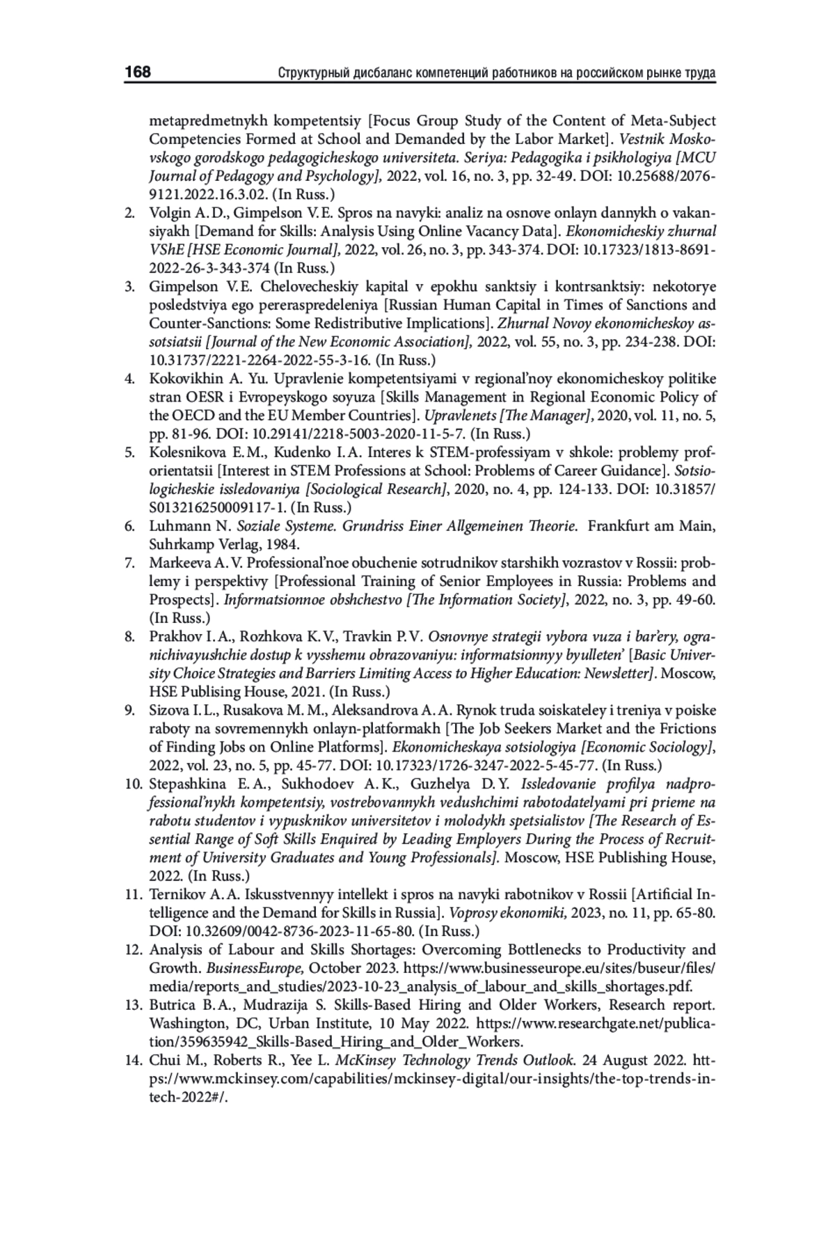 2. Волгин А. Д., Гимпельсон В. Е. Спрос на навыки: анализ на основе онлайн данных о вакансиях // Экономический журнал ВШЭ. 2022. Т. 26. № 3. С. 343-374. https://doi.org/10.17323/1813-8691-2022-26-3-343-374.