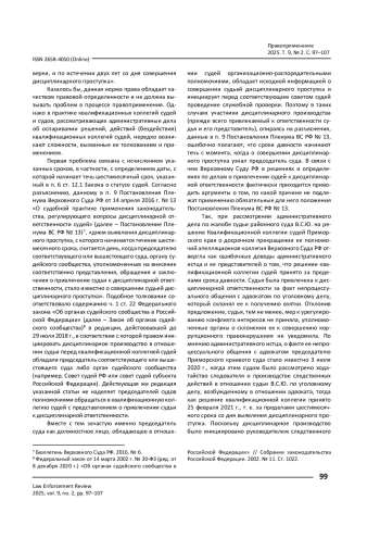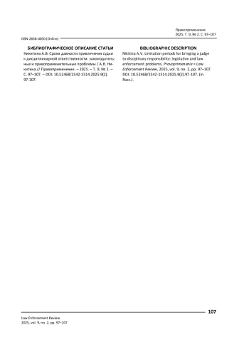 21. 	Клеандров М. И. О современных проблемах механизма ответственности судей за дисциплинарный проступок: правоприменительная практика, общие подходы. Часть 1. Прекращение полномочий судьи за тяжкое правонарушение после конституционных нововведений 2020 года - конституционная или дисциплинарная ответственность? / М. И. Клеандров // Государство и право. - 2024. - № 3. - С. 39-59. -. DOI: 10.31857/S1026945224030044