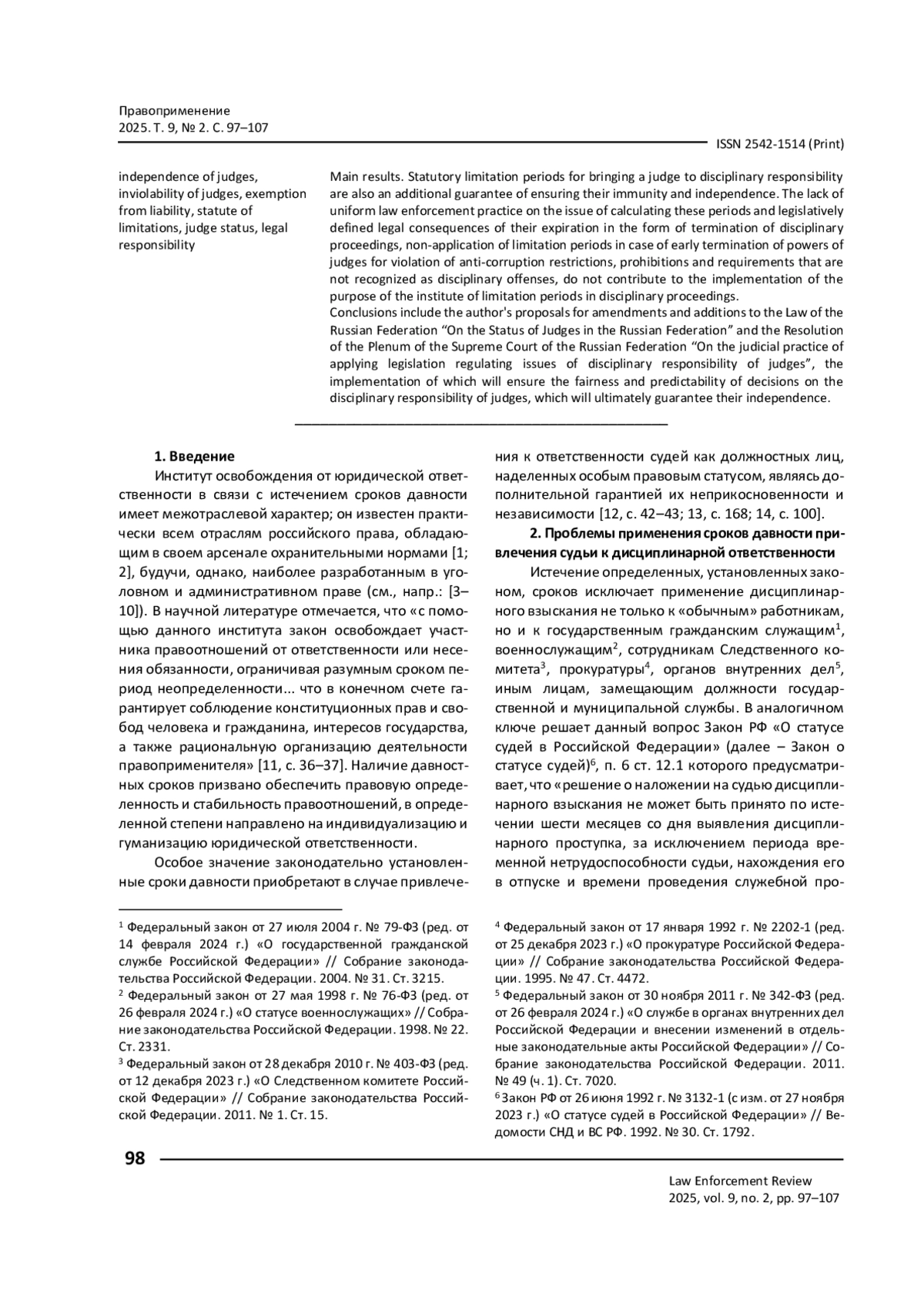 Законодательно установленные сроки давности привлечения судьи к дисциплинарной ответственности являются дополнительной гарантией обеспечения их неприкосновенности и независимости. В статье отмечается отсутствие единообразной правоприменительной практики по вопросу исчисления указанных сроков и законодательно определенных правовых последствий их истечения в виде прекращения дисциплинарного производства, неприменение сроков давности при досрочном прекращении полномочий судей за нарушения, не признаваемые дисциплинарными проступками, что не способствует реализации предназначения института сроков давности в дисциплинарном производстве. Автором сформулированы предложения о внесении изменений и дополнений в Закон РФ «О статусе судей в Российской Федерации» и Постановление Пленума Верховного Суда РФ «О судебной практике применения законодательства, регулирующего вопросы дисциплинарной ответственности судей». Реализация этих предложений позволит обеспечить справедливость и предсказуемость решений о дисциплинарной ответственности судей, что в конечном итоге будет гарантировать их независимость.