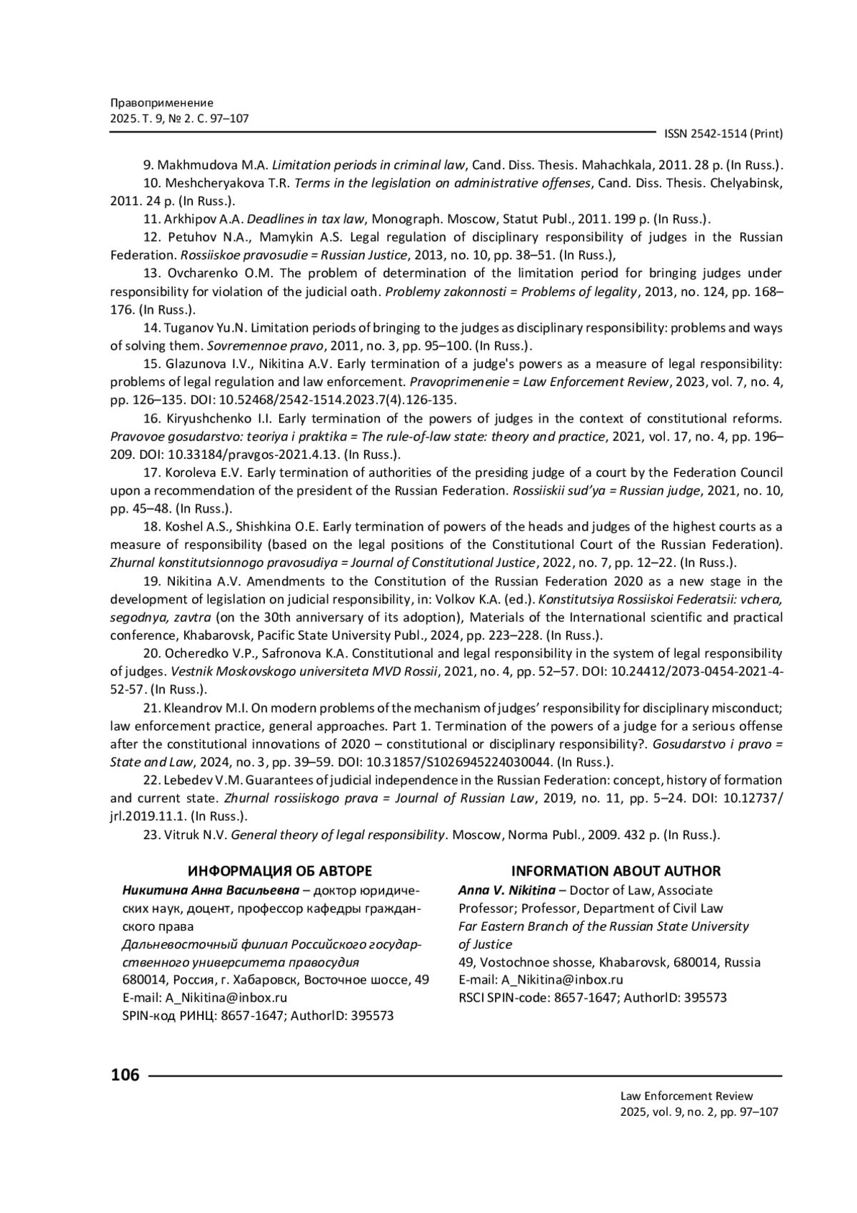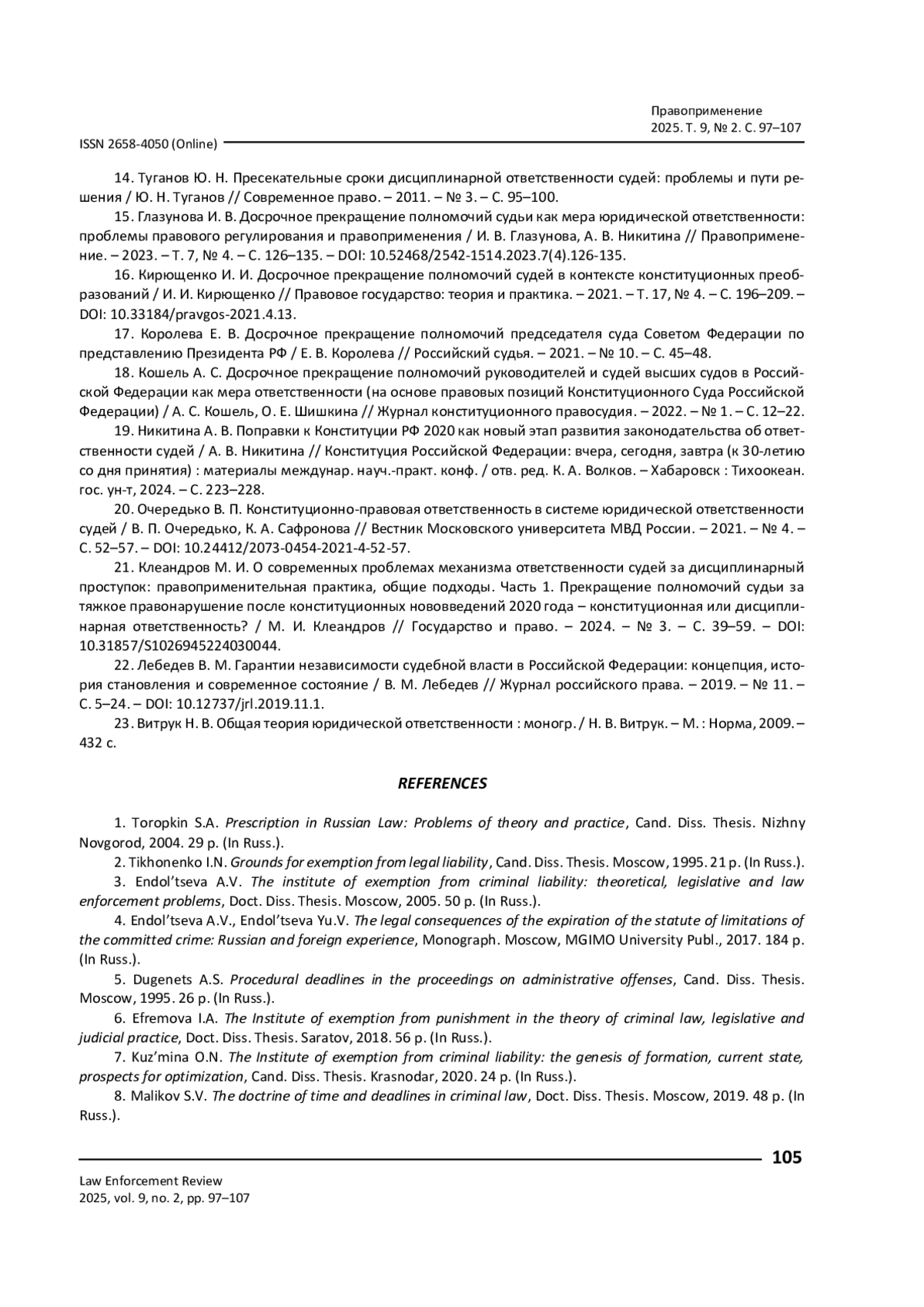 15. 	Глазунова И. В. Досрочное прекращение полномочий судьи как мера юридической ответственности: проблемы правового регулирования и правоприменения / И. В. Глазунова, А. В. Никитина // Правоприменение. - 2023. - Т. 7, № 4. - С. 126-135. -. DOI: 10.52468/2542-1514.2023.7(4).126-135 EDN: HPZUSW