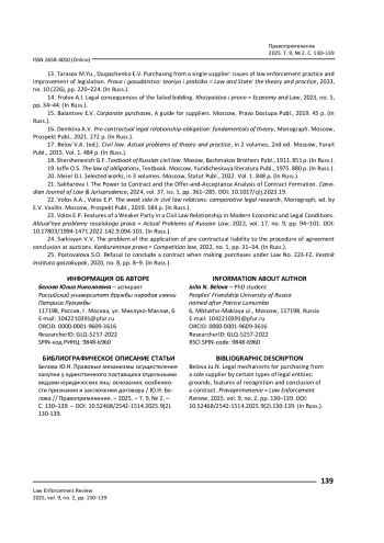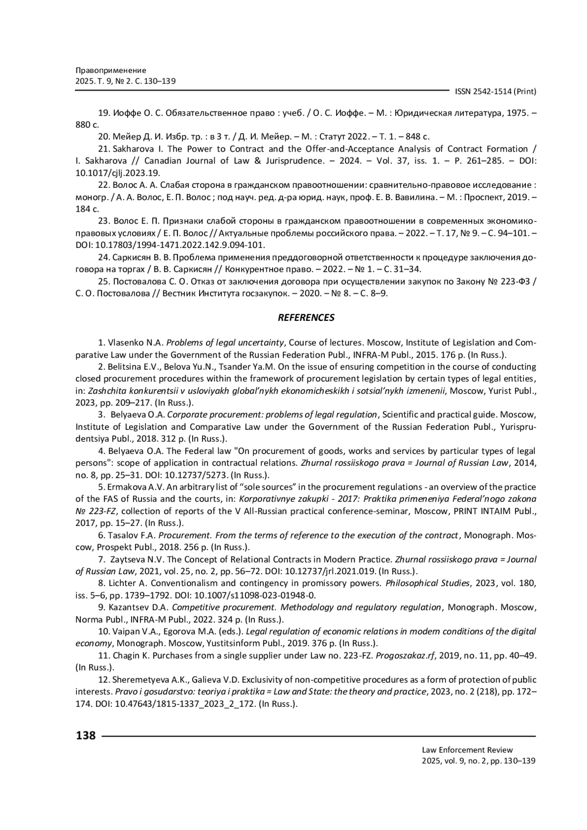 25. Постовалова С. О. Отказ от заключения договора при осуществлении закупок по Закону № 223-ФЗ / С. О. Постовалова // Вестник Института госзакупок. - 2020. - № 8. - С. 8-9.