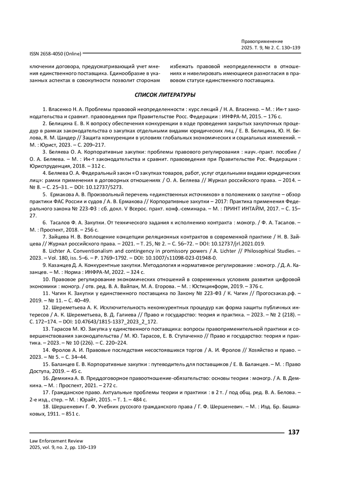 7. Зайцева Н. В. Воплощение концепции реляционных контрактов в современной практике / Н. В. Зайцева // Журнал российского права. - 2021. - Т. 25, № 2. - С. 56-72. - https://doi.org/10.12737/jrl.2021.019.