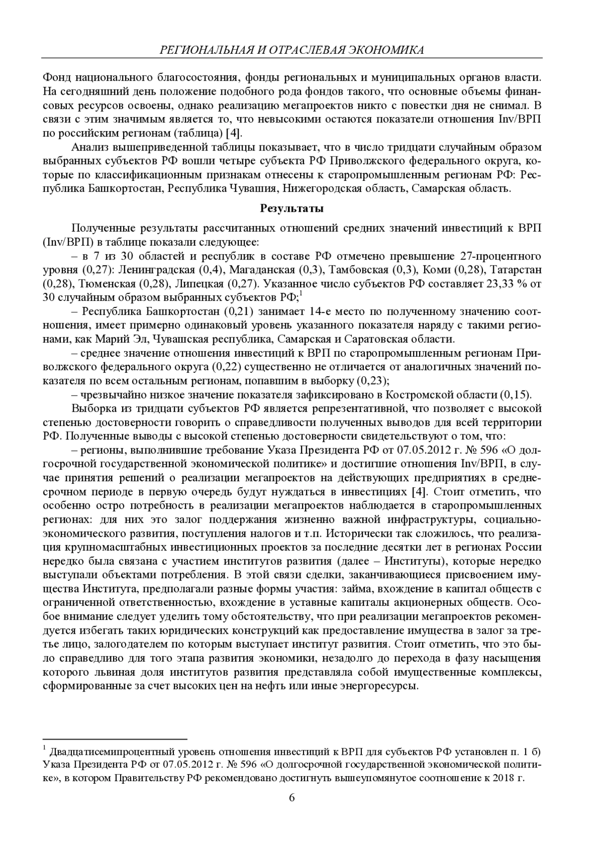 В данной статье на основании выполненных расчетов отношения инвестиций к валовому региональному продукту по данным территориальных органов Росстата в тридцати случайным образом выбранных субъектах РФ делаются выводы о состоянии соответствия полученных значений ориентиру пп. б) п.1 Указа Президента РФ от 07.05.2012 г. No 596 «О долгосрочной государственной экономической политике» в части соответствия двадцатисемипроцентному уровню увеличения объема инвестиций (к 2018 году). С учетом полученных выводов в целях обеспечения экономической безопасности российских регионов предлагается перспективный механизм реализации мегапроектов, в процессе функционирования которого возможно преодоление негативных последствий растущей инфляции на развитие критически важных сфер экономической деятельности