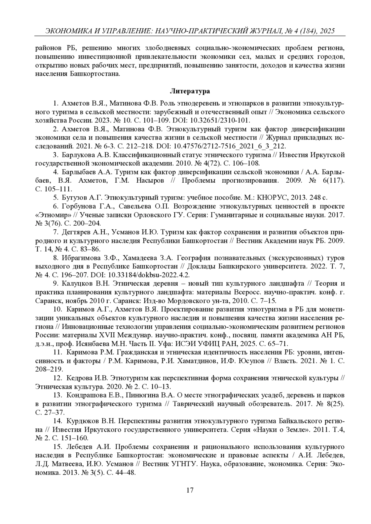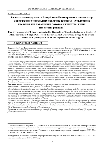 10. 	Каримов А.Г., Ахметов В.Я. Проектирование развития этнотуризма в РБ для монетизации уникальных объектов культурного наследия и повышения качества жизни населения региона // Инновационные технологии управления социально-экономическим развитием регионов России: материалы XVII Междунар. научно-практич. конф., посвящ. памяти академика АН РБ, д.э.н., проф. Исянбаева М.Н. Часть II. Уфа: ИСЭИ УФИЦ РАН, 2025. С. 65-71.  EDN: TWVCSY