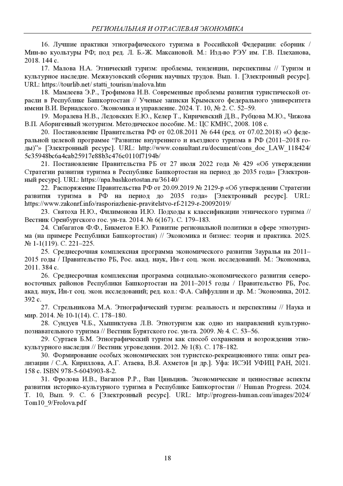 31. 	Фролова И.В., Вагапов Р.Р., Ван Цяньцянь. Экономические и ценностные аспекты развития историко-культурного туризма в Республике Башкортостан // Human Progress. 2024. Т. 10, Вып. 9. С. 6 [Электронный ресурс]. URL: http://progress-human.com/images/2024/ Tom10_9/Frolova.pdf.  EDN: XJDGON