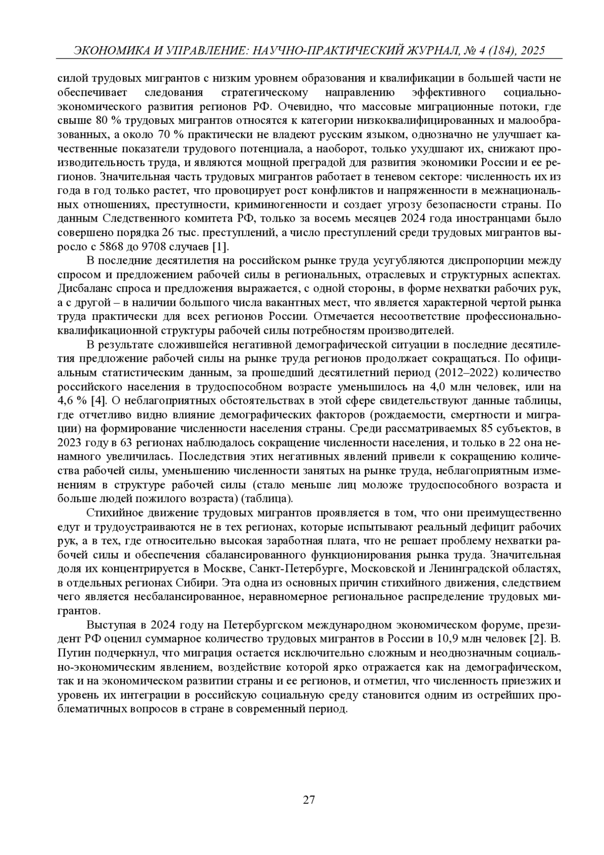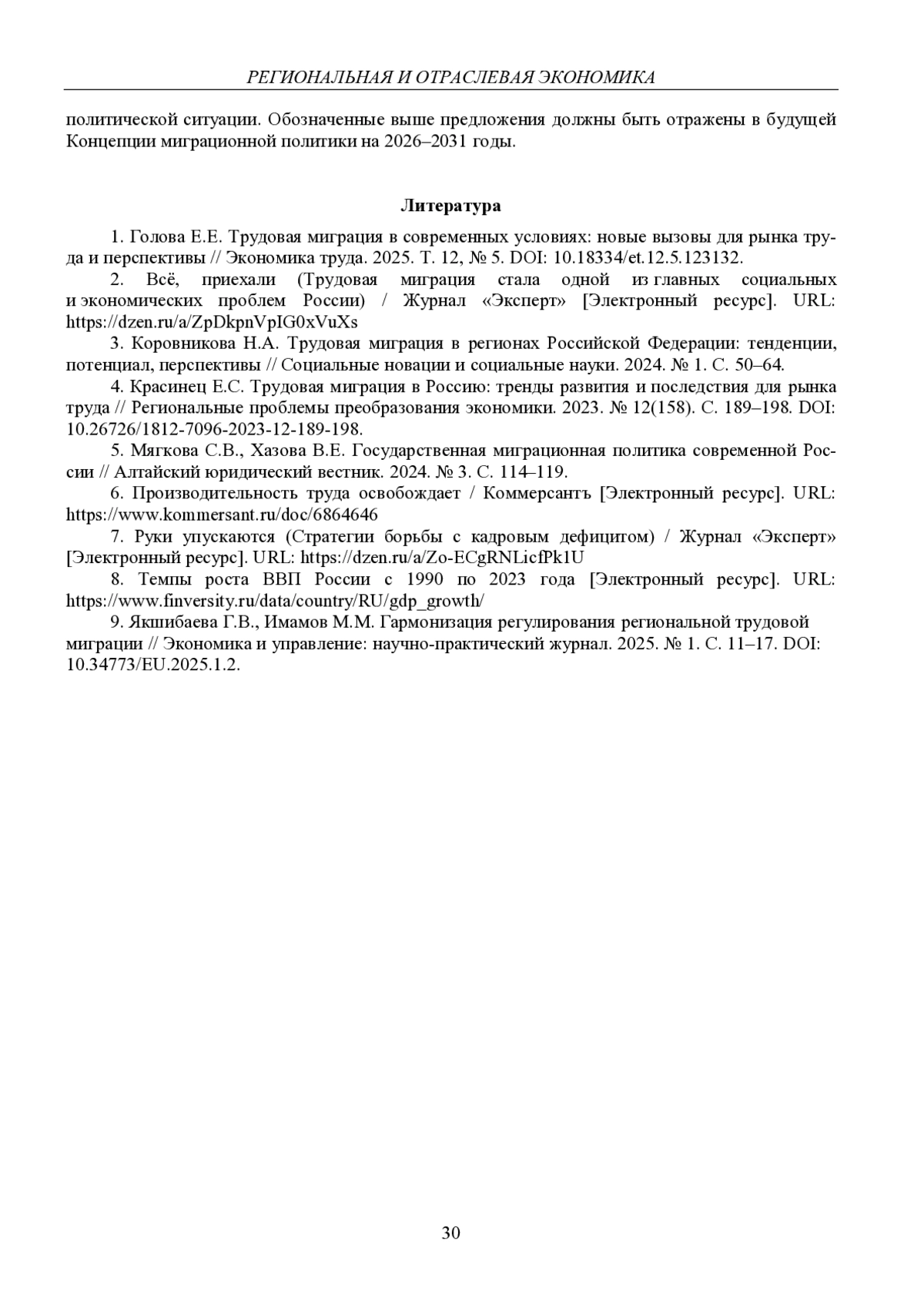 1. 	Голова Е.Е. Трудовая миграция в современных условиях: новые вызовы для рынка труда и перспективы // Экономика труда. 2025. Т. 12, № 5. DOI: 10.18334/et.12.5.123132 EDN: WGSLPB