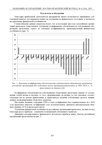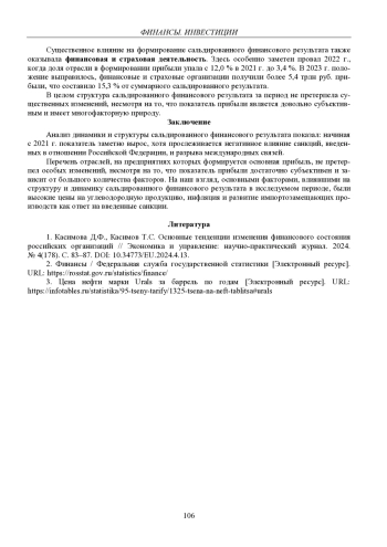 1. Касимова Д.Ф., Касимов Т.С. Основные тенденции изменения финансового состояния российских организаций // Экономика и управление: научно-практический журнал. 2024. № 4(178). С. 83-87. DOI: 10.34773/EU.2024.4.13 EDN: VEDPQE