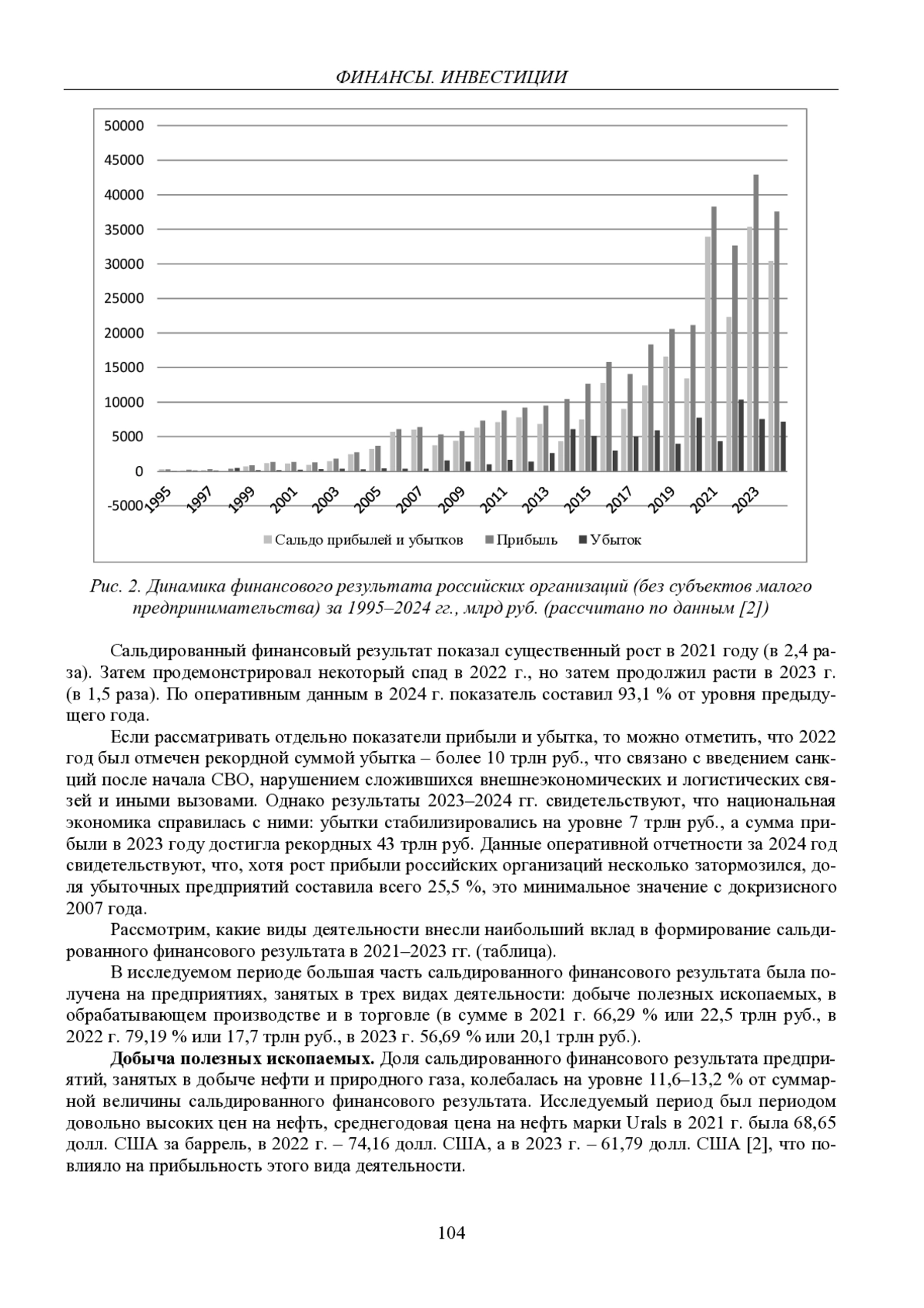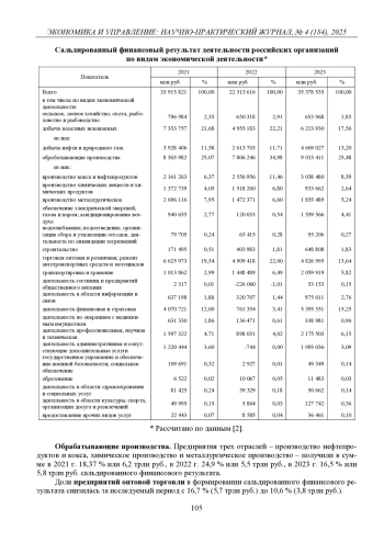 В статье проанализированы динамика сальдированных финансовых результатов российских организаций за период с 1995 года, выявлены основные факторы, повлиявшие на данные изменения. За 2021–2023 гг. проведен анализ структуры сальдированного финансового результата в разрезе видов экономической деятельности. Выявлены отрасли, внесшие наибольший вклад в его формирование.