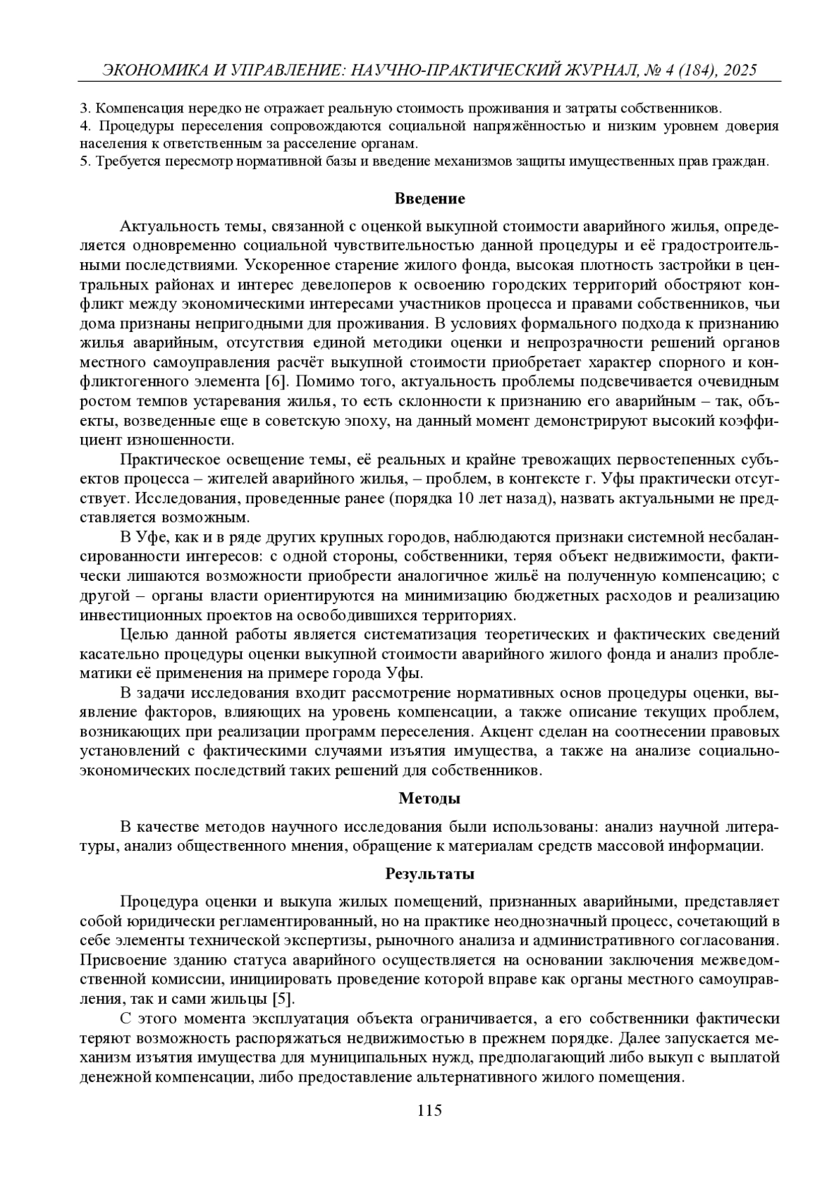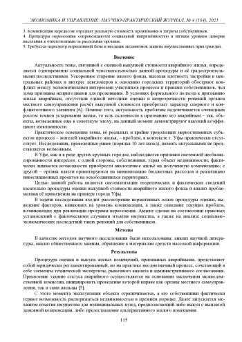 В статье освещаются теоретические основы оценки и выкупа жилых помещений, признанных аварийными, с акцентом на методы расчёта компенсации, правовые процедуры и подходы к формированию стоимости. Представлен обзор действующих моделей оценки с выделением их применимости в условиях изъятия имущества. На основе анализа материалов региональных источников и экспертных комментариев исследуется ситуация в г. Уфе, выявляются противоречия между нормативными положениями и реальной практикой переселения. Отмечается необходимость адаптации механизмов оценки и повышения прозрачности процедур для обеспечения справедливой компенсации собственникам