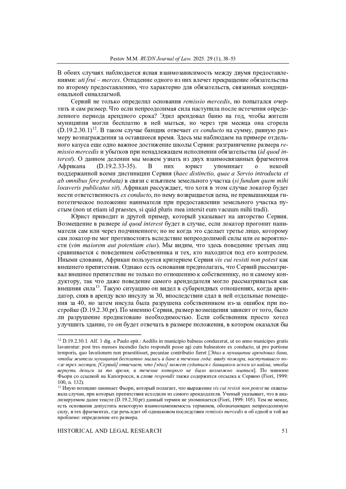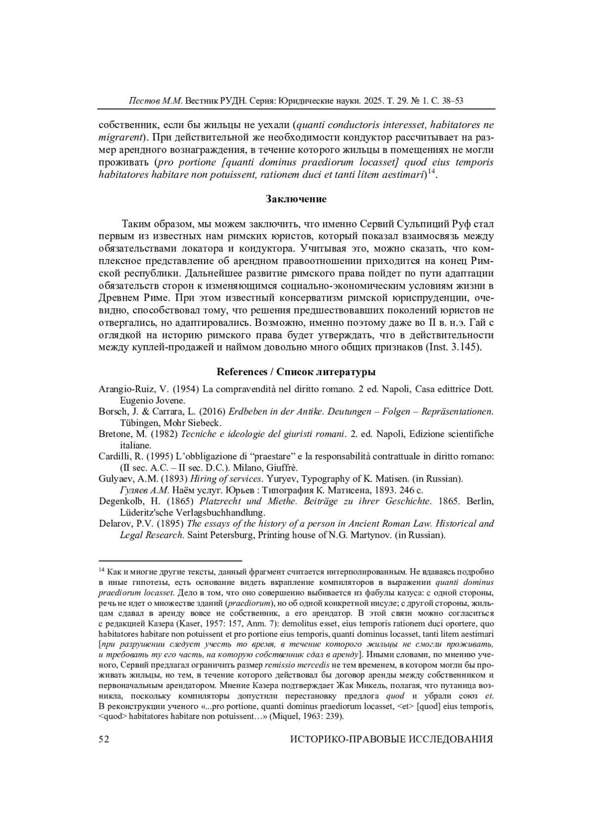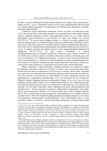 Современное гражданское право характеризуется появлением непоименованных и смешанных договорных типов. Это подталкивает правоприминителя к выявлению характеристик, на основе которых возможна классификация договоров для обеспечения нормативной определенности. Подобное положение дел имеет место при разграничении договора аренды от иных соглашений, связанных с передачей имущества на определенный срок. Данная потребность впервые возникла еще в древнеримском праве. Цель состоит в проведении исторического исследования с выявлением конкретных предпосылок, обусловивших обособление договора найма в Древнем Риме. Использован историко-филологический, систематический и телеологический методы экзегезы античных текстов. Полученные результаты показывают, что первоначальной формой арендных отношений являлась временная продажа объекта найма. Источники свидетельствуют о применении данной формы для использования труда подвластного лица, а также при эксплуатации общественной земли. В период Римской республики арендное правоотношение постепенно начинает обособляться от купли-продажи. Попытки систематизации римского права I в. до н. э. уже разделяют два договора между собой. В этот же период юрист Сервий Сульпиций Руф через учение о непреодолимой силе конкретизирует обязательство арендодателя, определяя сферу его риска и основания для вычета и возврата арендных платежей. Из этого следует вывод, что распределение риска между сторонами способствовало определению границ обязательств локатора и кондуктора, которые с этого момента приобрели самостоятельный характер.
