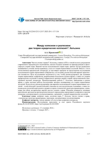Чистое учение о праве Г. Кельзена, ставшее в XX в. точкой отсчета для развития современного юридического позитивизма, оказало большое влияние на юриспруденцию и философскую теорию норм. Важной частью кельзеновской теории норм, причем частью радикально менявшейся в течение жизни правоведа, стала его теория нормативных коллизий. Вместе с тем в отечественной юридической литературе до настоящего времени не представлены исследования кельзеновской теории нормативных конфликтов, а ее поздний, реалистический вариант практически неизвестен. Цель исследования заключается в том, чтобы реконструировать две основные теории нормативных конфликтов, разработанные Кельзеном в разное время, а также его теорию иерархических коллизий и оценить корректность критики данных теорий, представленной в иностранной научной литературе. Проанализированы работы Г. Кельзена, написанные в разное время, а также научные работы последующих авторов, посвященные его теории нормативных коллизий. В результате реконструированы два варианта кельзеновской теории нормативных коллизий - холистический и реалистический, показаны их методологические основания, а также показана роль коллизий норм разного уровня в теории ступенчатой структуры правопорядка, одинаковая для обеих исторических версий чистого учения о праве. Показана уязвимость основных критических аргументов против реалистического определения нормативного конфликта и против доктрины «альтернативного уполномочивания», связанной с теорией иерархических коллизий.