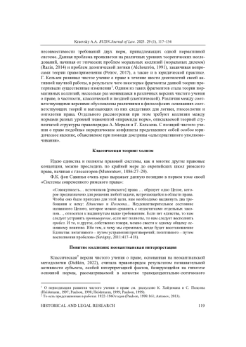 В научной литературе чистое учение о праве Г. Кельзена часто обозначается термином «нормативизм» (Paulson, 1993), что подчеркивает акцент, который данная теория делает на роли норм в онтологии права. Одной из классических проблем теории норм является проблема нормативных конфликтов или коллизий – ситуаций несовместимости требований двух норм, принадлежащих одной нормативной системе.