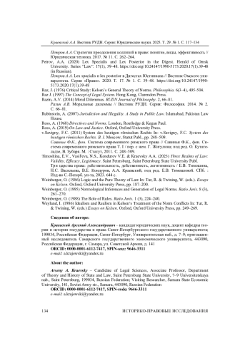 27. Kraevsky, A.A. (2015) Hans Kelsen’s Pure Theory of Law and Modern Legal Positivism. Proceedings of Higher Educational Institutions. Pravovedenie. 2, pp. 88-125.