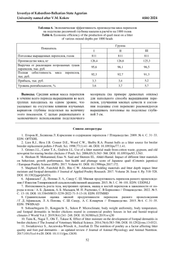 Исследование проводили с целью выявления целесообразной глубины насыпи подстилочного материала для выращивания перепелов на мясо. Работу выполняли в зимний период 2023-2024 гг. в условиях учебно-производственного птичника РГАУ-МСХА имени К. А. Тимирязева. Для этого методом пар-аналогов были сформированы 3 группы мясо-яичных перепелов маньчжурской породы по 57 голов в каждой. Птицу выращивали на глубокой подстилке с плотностью посадки 0,02 м2 на 1 голову при постоянном доступе к корму и воде в условиях нормативного микроклимата до 39-суточного возраста. Глубина насыпи подстилочного материала в группе I (контрольной) составляла 10 см; в группе II - 7 см; в группе III - 5 см. Выращивание перепелов на подстилке глубиной 5 см привело к увеличению сохранности поголовья в возрасте 5 суток в среднем на 4,0%; снижению расхода корма на 1 кг прироста живой массы за 2 недели выращивания на 1,59 кг; улучшению состояния подошвы стоп перепелов в среднем на 1,4 балла и качества подстилки на 2,5 балла. Существенной разности по продуктивности и мясным качествам между перепелами разных групп не наблюдали. Снижение глубины насыпи подстилки с 10 до 5 см позволяет при сохранении зоотехнической эффективности производства мяса перепелов сократить затраты на подстилочный материал и улучшить состояние подошвы стоп птицы.
