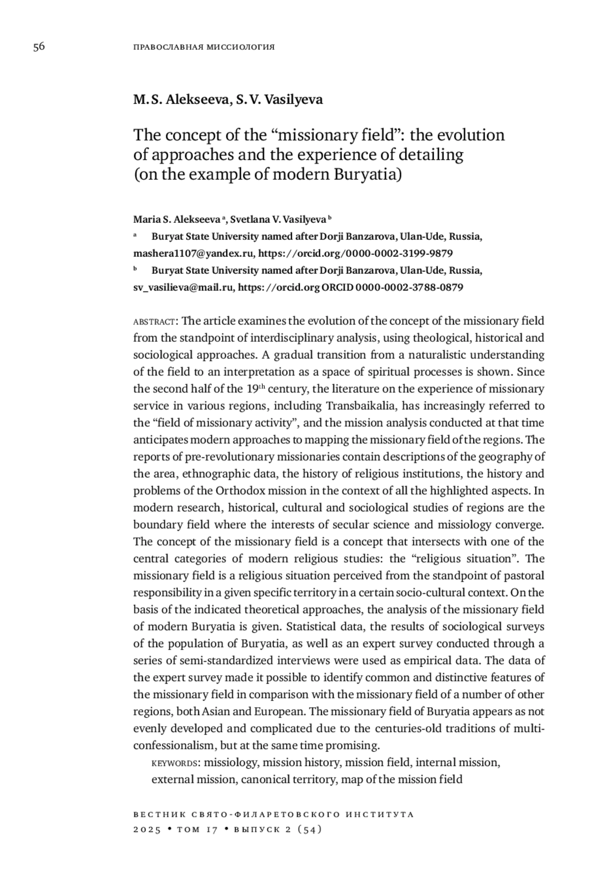 В статье представлены результаты междисциплинарного анализа концепта «миссионерское поле» с использованием богословского, исторического и социологического подходов. Показано постепенное развитие понятия от его натуралистического образа к трактовке поля как пространства осуществления духовных процессов. Со второй половины XIX в. в литературе, посвященной опыту миссионерского служения в различных регионах, в том числе в Забайкалье, все чаще употреблялось выражение «поле миссионерской деятельности», а проводимый в то время анализ миссии предвосхитил современные подходы к составлению карт миссионерского поля регионов. В отчетах дореволюционных миссионеров содержатся описание географии местности, этнографические данные, история религиозных институций, обозначены проблемы православной миссии в контексте специфики региона. В настоящее время историко-культурные и социологические аспекты исследования регионов - та пограничная область, где сходятся интересы светской науки и миссиологии. Концепт «миссионерское поле» пересекается с понятием «религиозная ситуация», которое является одним из центральных в современном религиоведении. Можно сказать, что миссионерское поле - это религиозная ситуация, воспринятая с позиций пастырской ответственности на данной конкретной территории. В статье с использованием обозначенных теоретических подходов дан анализ миссионерского поля современной Бурятии. В качестве эмпирической базы были использованы статистические данные, результаты социологических опросов населения Бурятии, а также экспертного опроса, проведенного с помощью серии полустандартизированных интервью. Данные экспертного опроса позволили выявить общие и отличительные особенности миссионерского поля Бурятии в сравнении с миссионерским полем ряда других азиатских и европейских регионов. Сделан вывод о том, что миссионерское поле Бурятии является перспективным, хотя оно неравномерно освоено и осложнено влиянием многовековых традиций поликонфессиональности.
