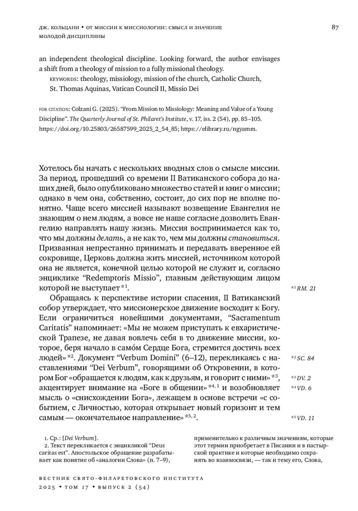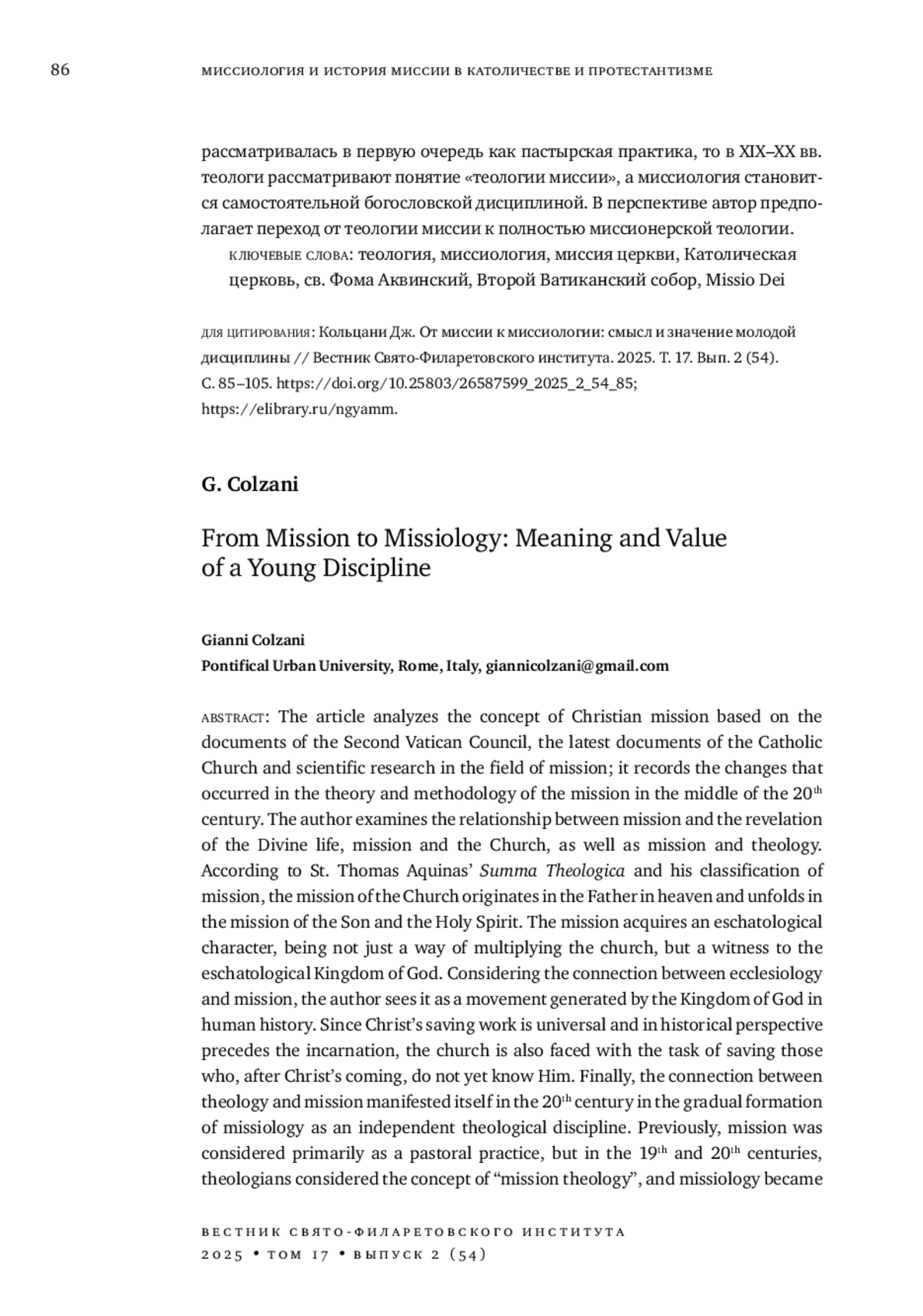 В статье анализируется понятие христианской миссии на материале документов II Ватиканского собора, новейших документов Католической церкви и научных исследований в области миссии; фиксируются изменения, произошедшие в теории и методологии миссии в середине XX в. Автор рассматривает связь между миссией и откровением Божественной жизни, миссией и Церковью, а также миссией и богословием. Согласно «Сумме теологии» св. Фомы Аквинского и его классификации миссии, миссия Церкви берет свое начало в Отце Небесном и раскрывается в миссии Сына и Духа Святого. Миссия приобретает эсхатологический характер, будучи не просто способом умножения церкви, но свидетельством об эсхатологическом Царстве Божьем. Рассматривая связь экклезиологии и миссии, автор видит ее как движение, порожденное Царством Божьим в человеческой истории. Поскольку спасительное действие Христа универсально и в исторической перспективе предшествует воплощению, то и перед церковью стоит задача спасения в том числе и тех, кто после прихода Христа еще Его не знают. Наконец, связь богословия и миссии проявляется в XX в. в постепенном становлении миссиологии как самостоятельной богословской дисциплины. Если раньше миссия рассматривалась в первую очередь как пастырская практика, то в XIX-XX вв. теологи рассматривают понятие «теологии миссии», а миссиология становится самостоятельной богословской дисциплиной. В перспективе автор предполагает переход от теологии миссии к полностью миссионерской теологии.