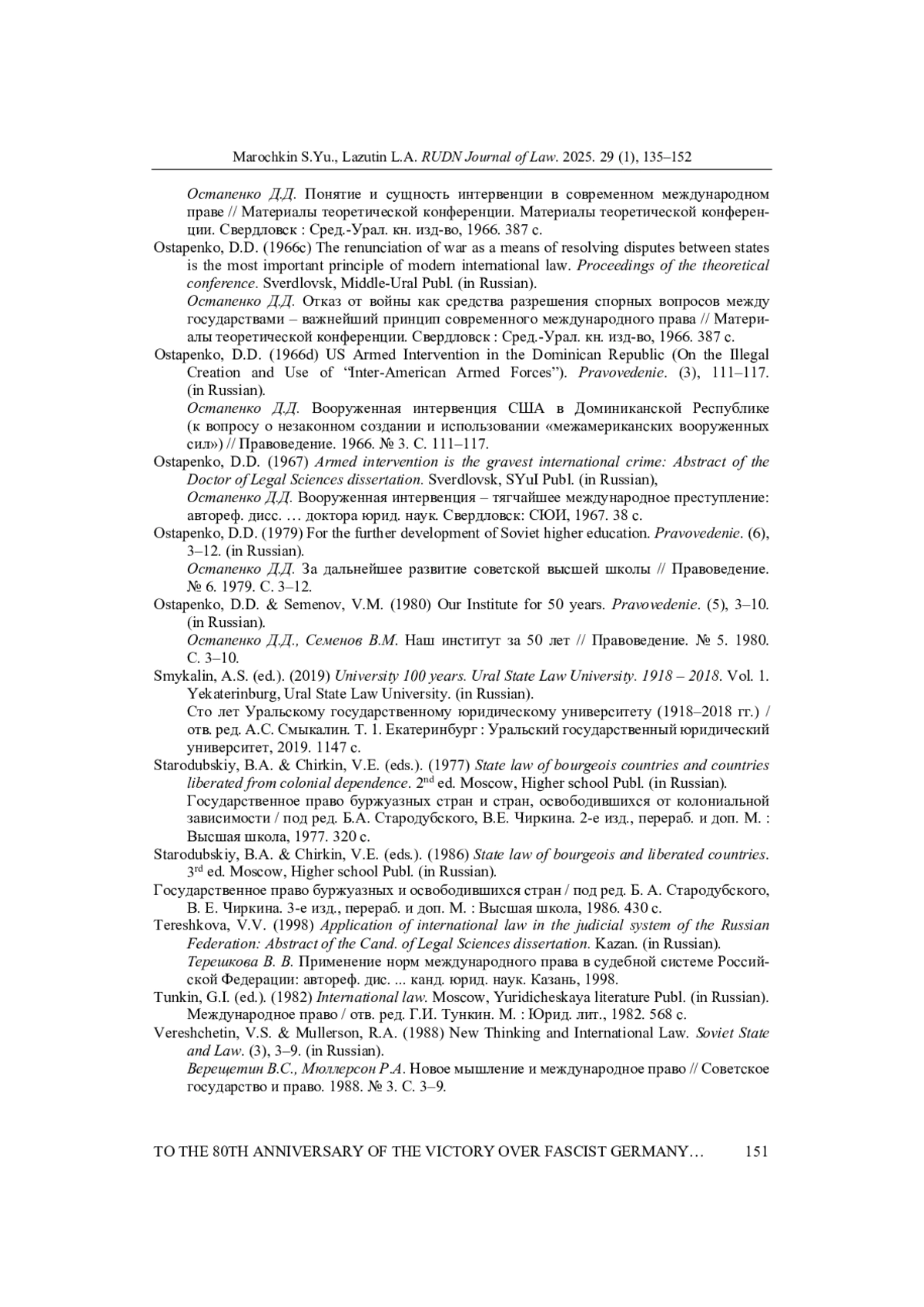 Цель работы - исследование вклада советского ученого-фронтовика Д. Д. Остапенко в развитие высшего юридического образования и формирование свердловской юридической научной школы. Показано значение его деятельности, научных публикаций в совершенствовании структуры высшего юридического образования, в частности, в определении современной роли предмета «международное право» в составе юридических дисциплин. Основное внимание уделяется участию Д. Д. Остапенко в становлении доктринальных основ международного права в период после окончания Второй мировой войны. Он был среди юристов-международников, кто научными исследованиями способствовал формированию облика современного международного права, начав теоретическую разработку нового послевоенного содержания его институтов: международного уголовного права, права международной ответственности, международного гуманитарного права. Значительную часть своих трудов он посвятил научному исследованию квалификации вооруженной интервенции и международно-правовой ответственности. По его убеждению, интервенция может быть вооруженной и без применения вооруженной силы, исходя из толкования и выявления содержания принципа невмешательства в Уставе ООН. Это дало ему основания сделать вывод о неограниченности сферы действия принципа в п. 7 ст. 2 Устава о невмешательстве во внутренние дела государств, они составляют внутреннюю компетенцию, и никто не имеет права вмешиваться в нее, за исключением вопросов, касающихся поддержания мира и безопасности. Д. Д. Остапенко оставил весьма значимый след в обосновании значения международного права во внутригосударственной правовой деятельности, соответственно, места этого предмета в высшем юридическом образовании. В статье показывается, что отношение к международному праву как имеющему важное значение в нормативном и индивидуальном правовом регулировании внутригосударственных отношений, в подготовке будущих юристов инициировано именно в Свердловском юридическом институте с решительным участием Д. Д. Остапенко.