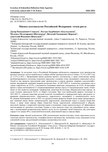 За последние годы в Российской Федерации наблюдается сокращение доли производства крупного рогатого скота в живой массе в общем объѐме производства скота и птицы с 21,3% в 2015 году до 17,3% в 2023 г. Проведѐнный анализ развития мясного скотоводства, а также комплексная оценка пробонитированного поголовья позволили определить основные точки дальнейшего отраслевого роста. Одной из них является структурный сдвиг производства в сторону крупных товарных сельскохозяйственных предприятий, имеющих мощную ресурсную базу. За 2015-2023 гг. количество племенных стад в стране сократилось на 22,5%, а численность племенных животных уменьшилась на 25,4%. В настоящее время в стране насчитывается 13 специализированных мясных пород и 9 внутрипородных типов. Основными из них являются калмыцкая, герефордская, казахская белоголовая, абердин-ангусская породы, на долю которых приходится 96,2% от общего поголовья. При этом наибольший прирост поголовья за 2015-2023 гг. показали животные русской комолой, галловейской и герефордской пород при резком сокращении абердин-ангусского, лимузинского, шаролезского, калмыцкого и симментальского скота. По данным бонитировки скота за 2023 год среднесуточные приросты живой массы выше среднеотраслевых значений имели бычки симментальской, шаролезской, лимузинской пород и породы бланк-блю бельж, а также тѐлки породы обрак, бланк-блю бельж, шаролезской, симментальской и абердинангусской. Данные о возрастной структуре коров в племенных стадах свидетельствуют об эффективном использовании их маточного поголовья. Однако и здесь имеются точки для дальнейшего роста, связанные с оптимизацией воспроизводства мясного скота, на что указывает такой показатель, как доля коров старше 8 лет свыше 40% у казахской белоголовой, лимузинской пород и породы обрак.
