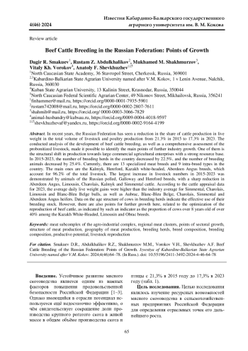 14. Улимбашев М. Б, Голембовский В. В., Вольный Д. Н. Состояние племенной базы мясного скотоводства Ставропольского края // Проблемы развития АПК региона. 2019. № 3(39). С. 192-197. EDN: HJRXTA