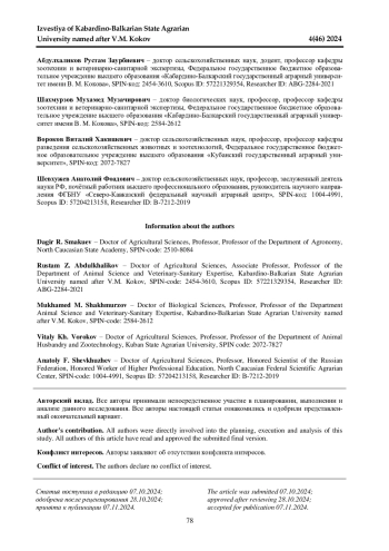 20. Shevhuzhev A.F., Belik N.I, Smakuev D.R. Changingcows’s productivity by influence yeast culture // Research Journal of Pharmaceutical, Biological and Chemical Sciences. 2016. T. 7. № 4. C. 430-434. EDN: XFMIJR