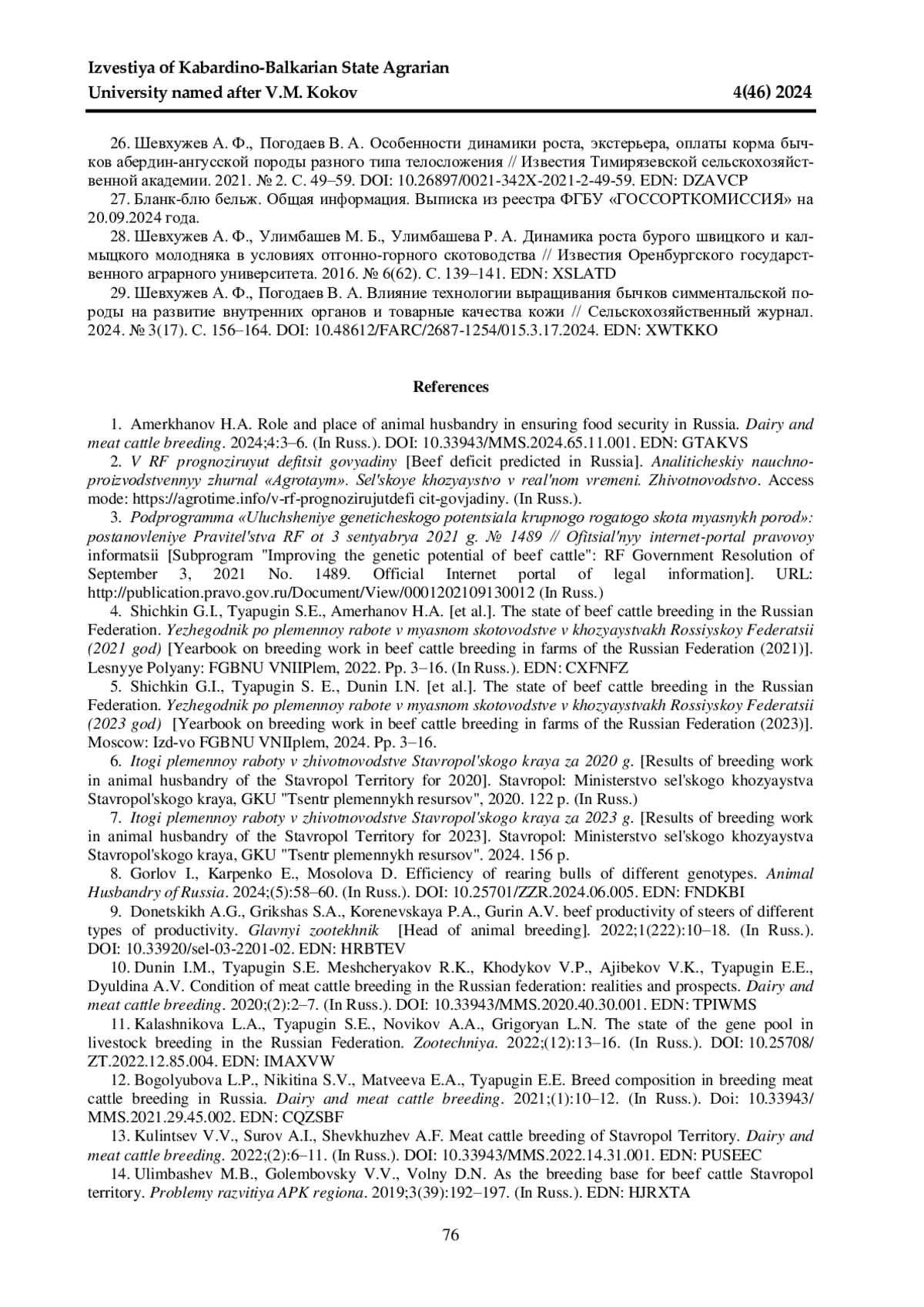 26. Шевхужев А. Ф., Погодаев В. А. Особенности динамики роста, экстерьера, оплаты корма бычков абердин-ангусской породы разного типа телосложения // Известия Тимирязевской сельскохозяйственной академии. 2021. № 2. С. 49-59. DOI: 10.26897/0021-342X-2021-2-49-59 EDN: DZAVCP