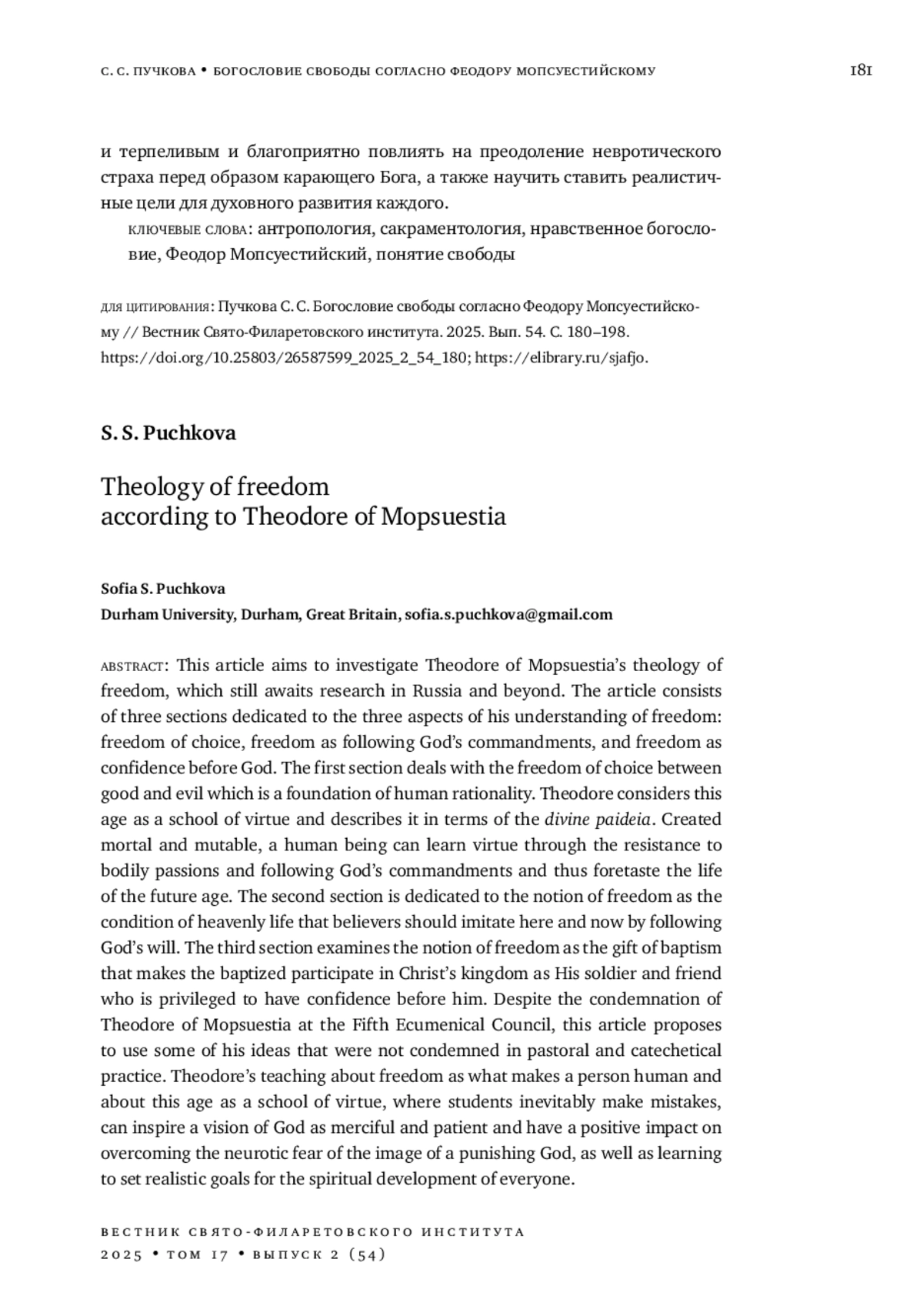 Настоящая статья посвящена теме, которой уделялось недостаточно внимания как в отечественной, так и в западной научной литературе, - богословию свободы Феодора Мопсуестийского (ок. 350-428). Статья состоит из трех частей, посвященных трем аспектам понимания свободы, предложенным автором: свобода человеческой воли, свобода как жизнь по божественным заповедям, свобода как дерзновение перед Богом. В первой части рассматривается свобода выбора между добром и злом, которая лежит в основе человеческой рациональности. Феодор видит век сей как школу добродетели и описывает ее в терминах «божественной педагогики». Человек, сотворенный в смертной и изменяемой природе, через преодоление страстей тела и следование заповедям способен учиться добродетели и предвкушать жизнь, которая ждет его в будущем веке. Вторая часть посвящена вопросу свободы как состоянию небесной жизни, которой верующие призваны подражать уже здесь на земле, исполняя волю Божью. В третьей части рассматривается свобода как дар крещения, в котором крещаемый становится причастным Христову Царству, воином и другом Христовым, имеющим дерзновение перед Ним. Несмотря на осуждение Феодора Мопсуестийского на Пятом вселенском соборе, в данной статье предлагается использовать некоторые его идеи, не подвергшиеся осуждению, в пастырской и катехизической практике. Учение Феодора о свободе как о том, что делает человека человеком, и о веке сем как школе добродетели, где учащиеся неизбежно совершают ошибки, может вдохновить на видение Бога милосердным и терпеливым и благоприятно повлиять на преодоление невротического страха перед образом карающего Бога, а также научить ставить реалистичные цели для духовного развития каждого.