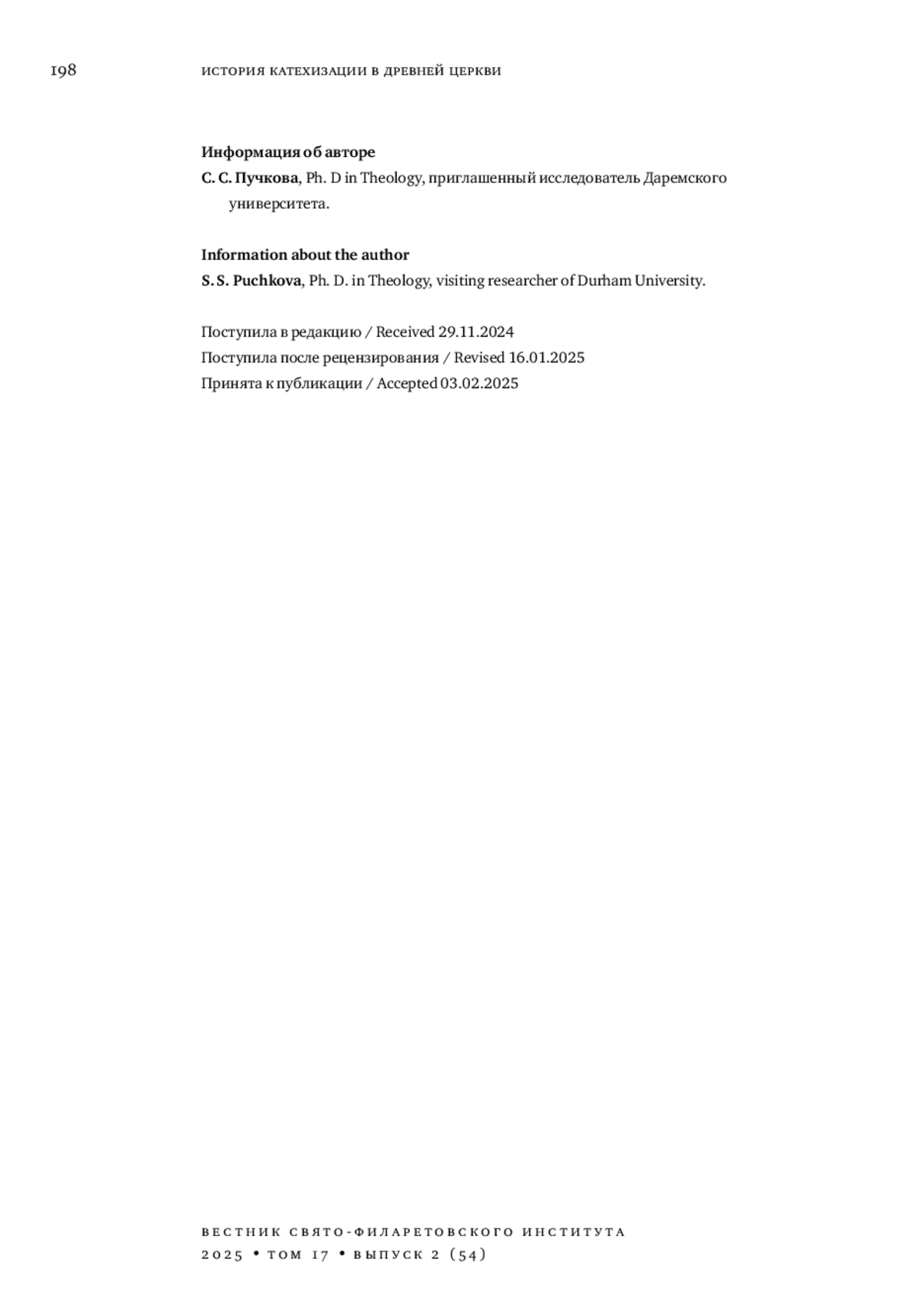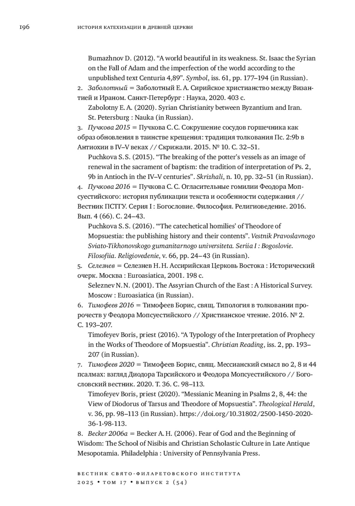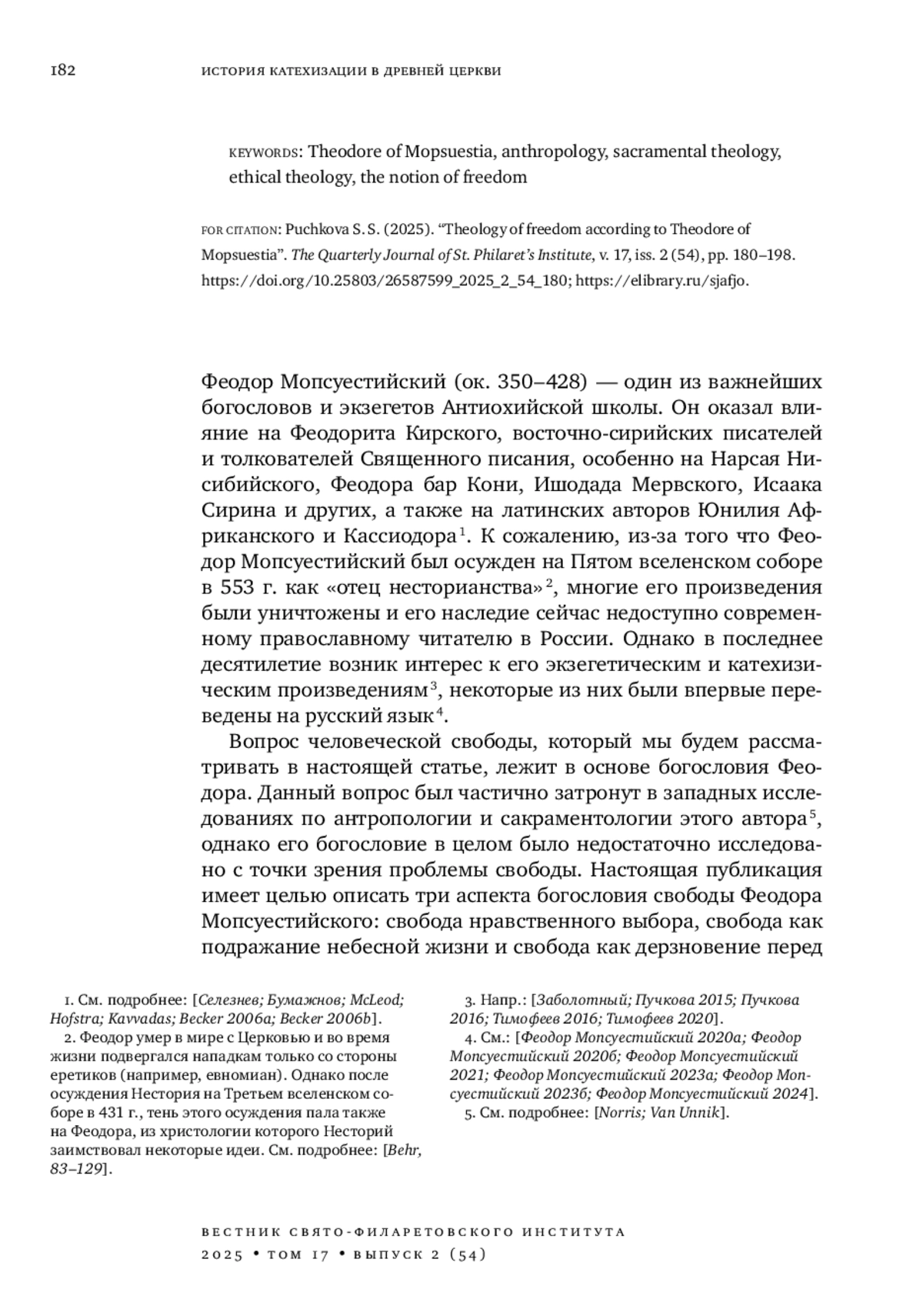 4. Пучкова С. С. Огласительные гомилии Феодора Мопсуестийского: история публикации текста и особенности содержания // Вестник ПСТГУ. Серия I: Богословие. Философия. Религиоведение. 2016. Вып. 4 (66). С. 24-43. DOI: 10.15382/sturI201666.24-43
