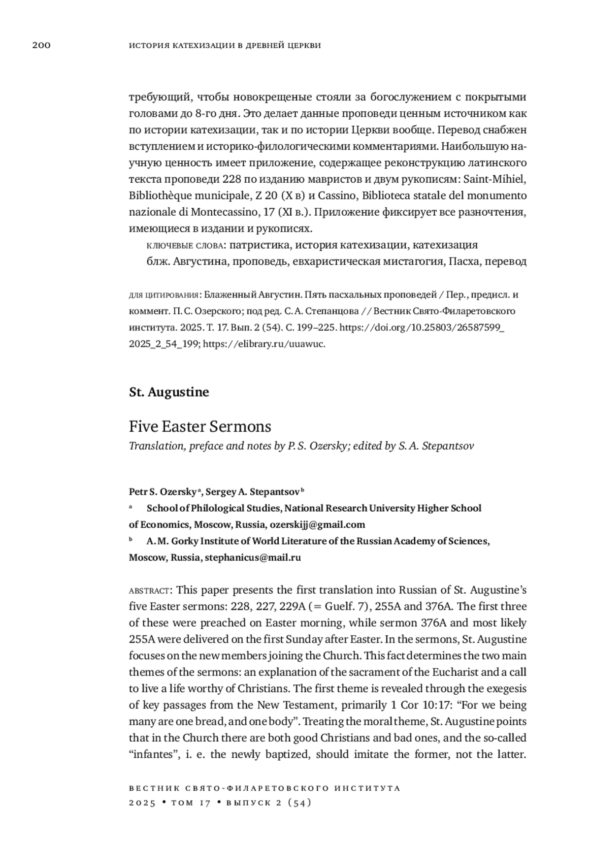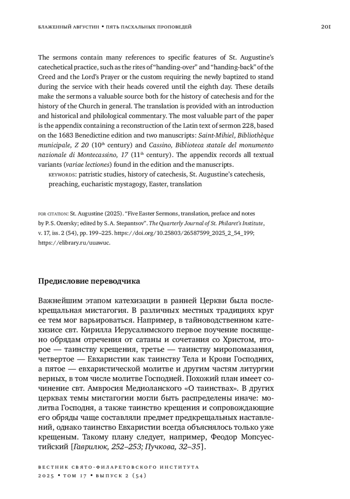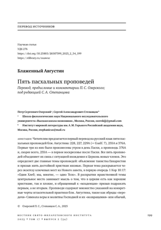 Читателям предлагается первый перевод на русский язык пяти пасхальных проповедей блж. Августина: 228, 227, 229A (= Guelf. 7), 255A и 376A. Первые три из них были произнесены утром в день Пасхи, а проповедь 376A и, скорее всего, 255A - в первое воскресенье после Пасхи. Все пять проповедей объединяет их связь с ситуацией вхождения в Церковь новых членов. Это определяет две главные темы проповедей: объяснение таинства Евхаристии и призыв жить достойной христиан жизнью. Первая тема раскрывается через экзегезу ключевых мест из Нового завета, в первую очередь 1 Кор 10:17: «Один Хлеб; мы, многие, - одно Тело». В раскрытии нравственной темы центральное место занимает мысль о том, что в церкви есть как хорошие христиане, так и плохие, и обращенный к «младенцам» призыв подражать первым, а не вторым. Проповеди содержат множество указаний на конкретные черты огласительной практики блж. Августина, такие как обряды «передачи» Символа веры и молитвы Господней и их « возвращения» или обычай, требующий, чтобы новокрещеные стояли за богослужением с покрытыми головами до 8-го дня. Это делает данные проповеди ценным источником как по истории катехизации, так и по истории Церкви вообще. Перевод снабжен вступлением и историко-филологическими комментариями. Наибольшую научную ценность имеет приложение, содержащее реконструкцию латинского текста проповеди 228 по изданию мавристов и двум рукописям: Saint-Mihiel, Bibliothèque municipale, Z 20 (X в) и Cassino, Biblioteca statale del monumento nazionale di Montecassino, 17 (XI в.). Приложение фиксирует все разночтения, имеющиеся в издании и рукописях.