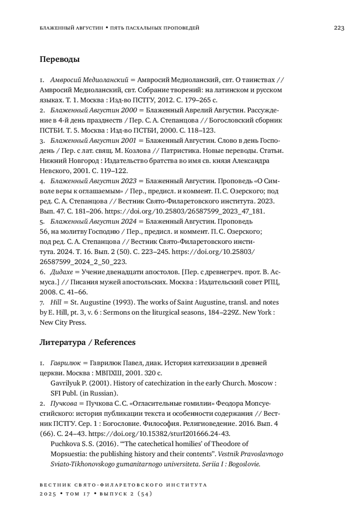 2. Пучкова С. С. “Огласительные гомилии” Феодора Мопсуестийского: история публикации текста и особенности содержания // Вестник ПСТГУ. Сер. 1: Богословие. Философия. Религиоведение. 2016. Вып. 4 (66). С. 24-43. DOI: 10.15382/sturI201666.24-43 EDN: WJBHOL