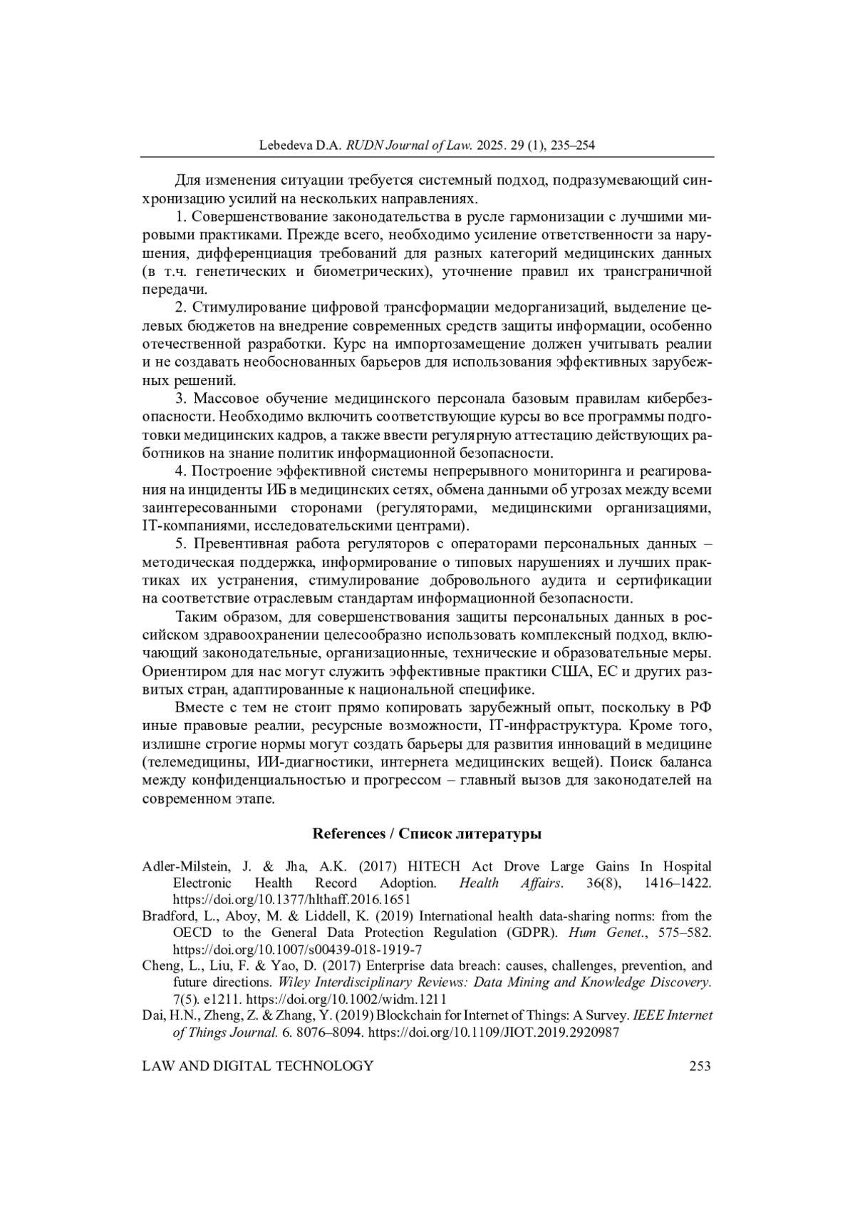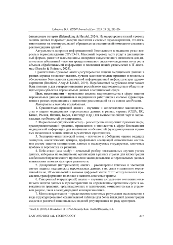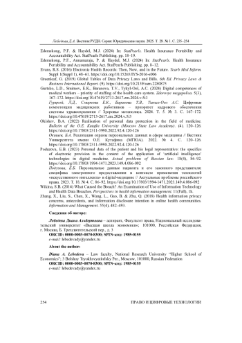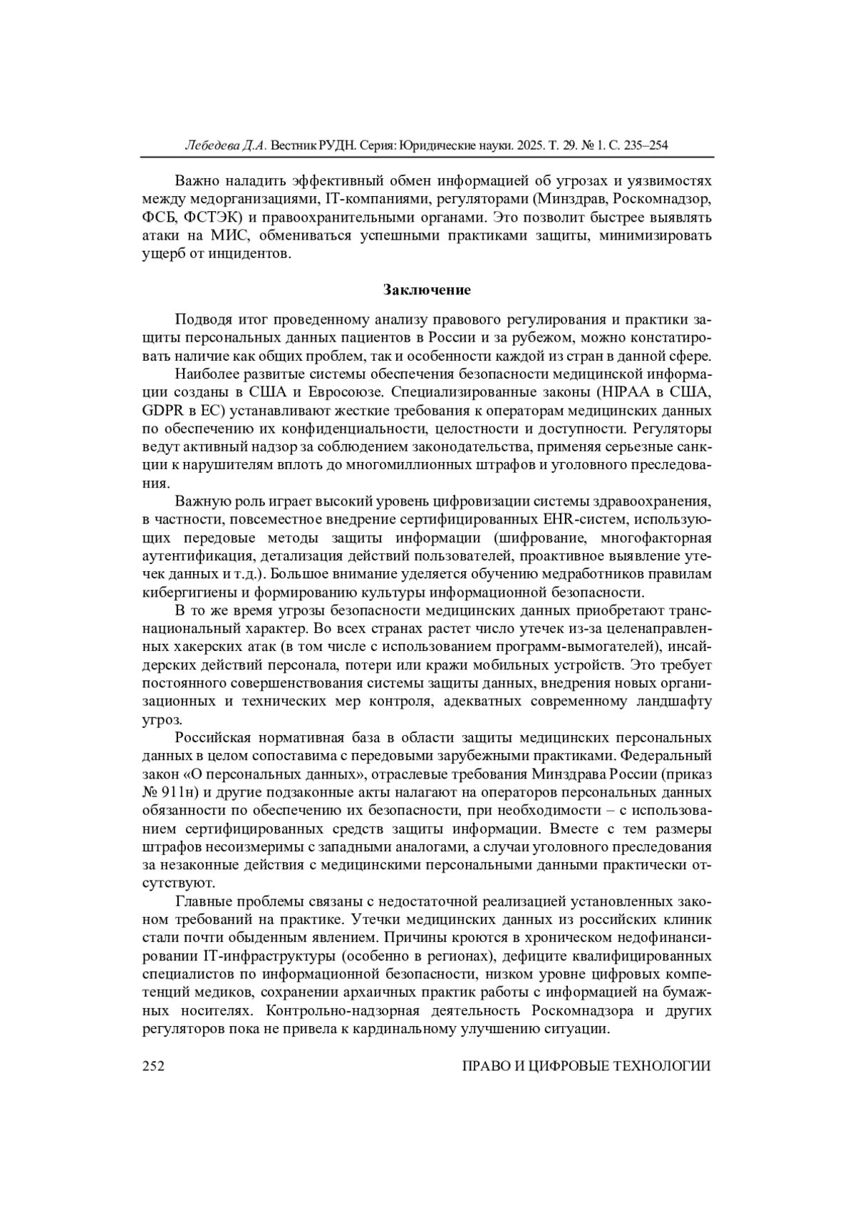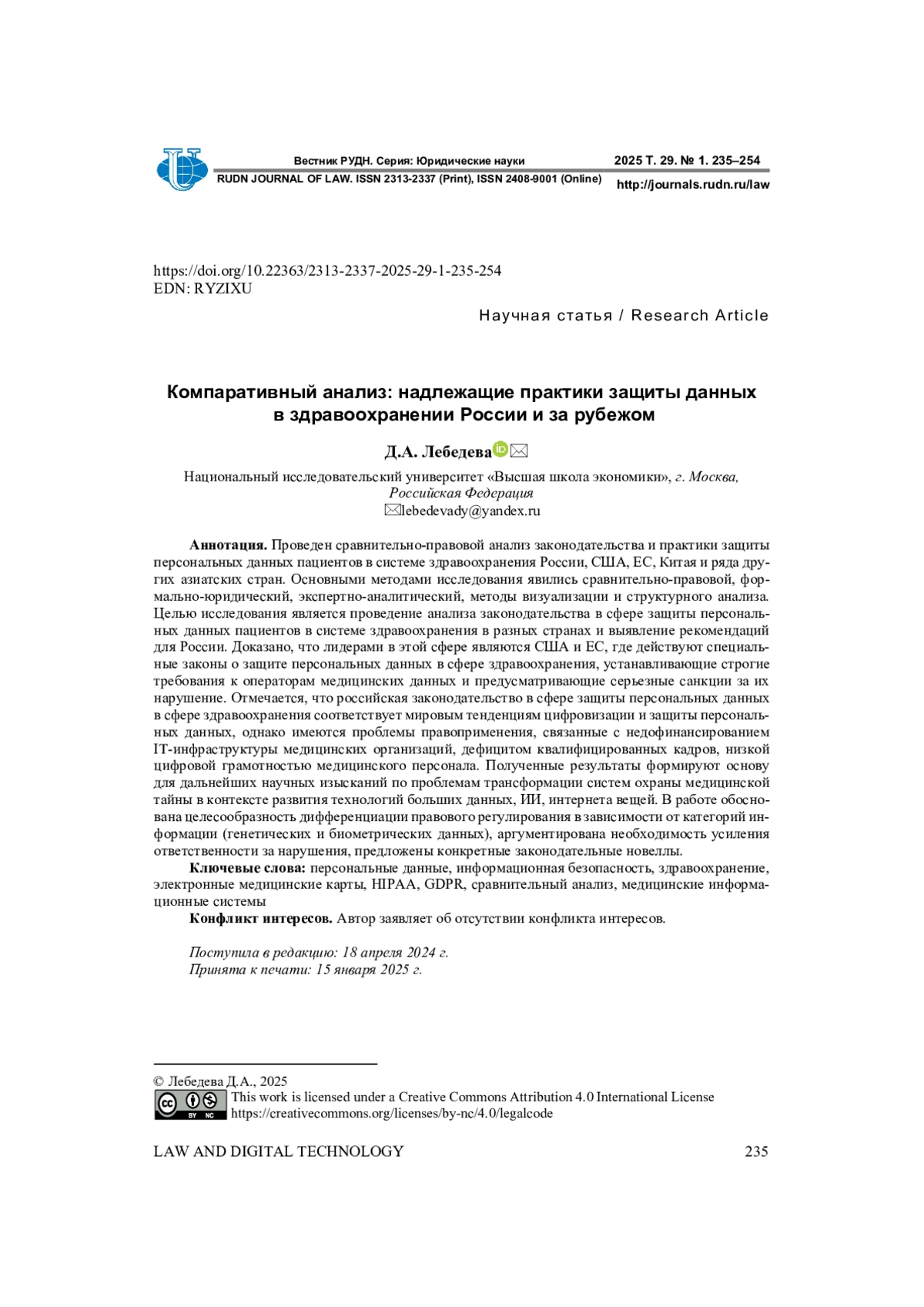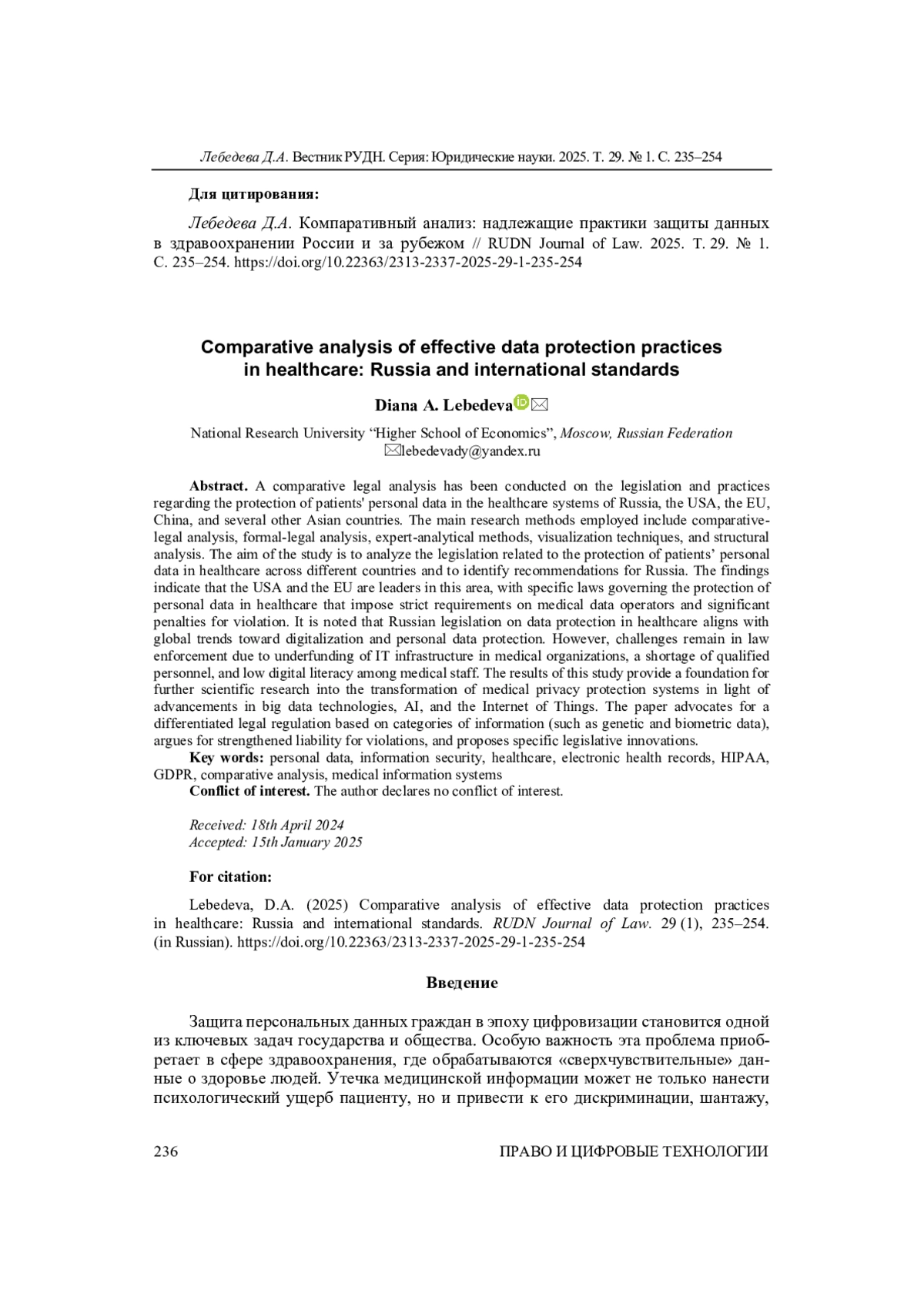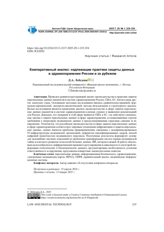ЛЕБЕДЕВА Д. А. КОМПАРАТИВНЫЙ АНАЛИЗ: НАДЛЕЖАЩИЕ ПРАКТИКИ ЗАЩИТЫ ДАННЫХ В ЗДРАВООХРАНЕНИИ РОССИИ И ЗА РУБЕЖОМ // ВЕСТНИК РОССИЙСКОГО УНИВЕРСИТЕТА ДРУЖБЫ НАРОДОВ. СЕРИЯ: ЮРИДИЧЕСКИЕ НАУКИ. 2025. Т. 29 № 1