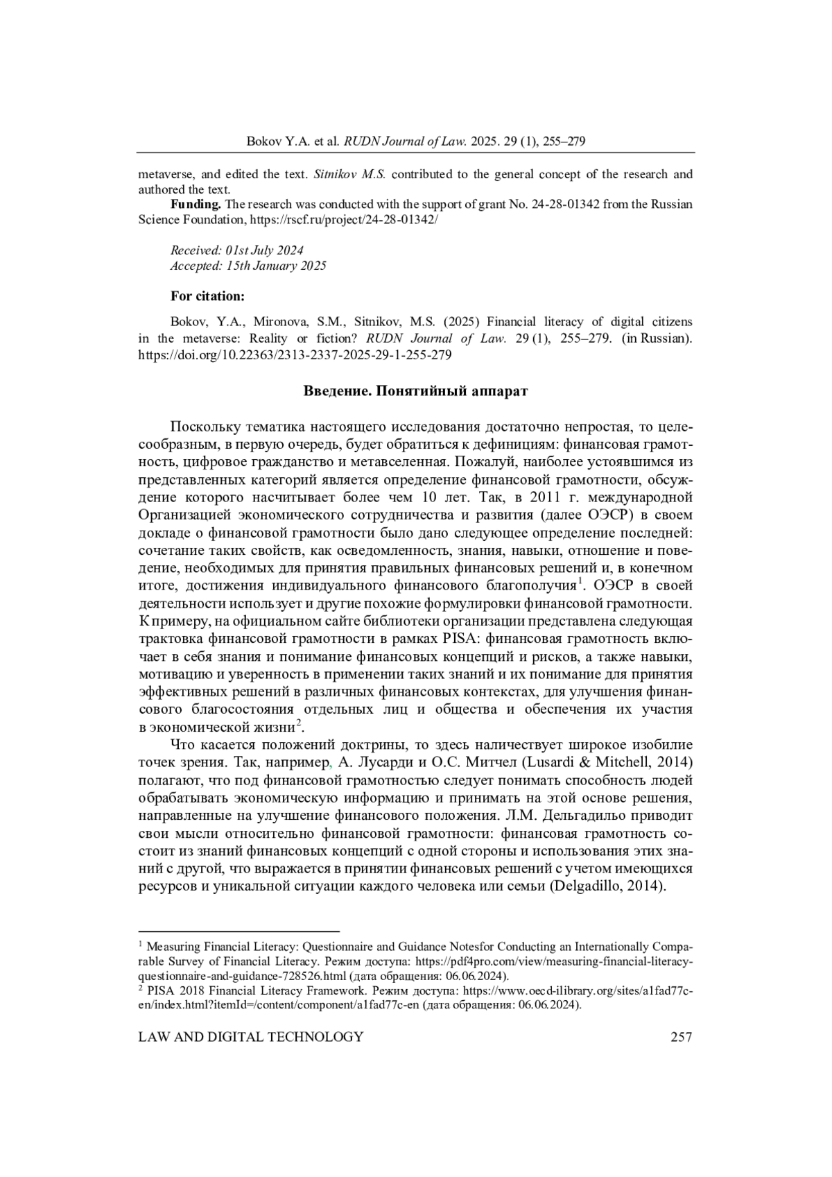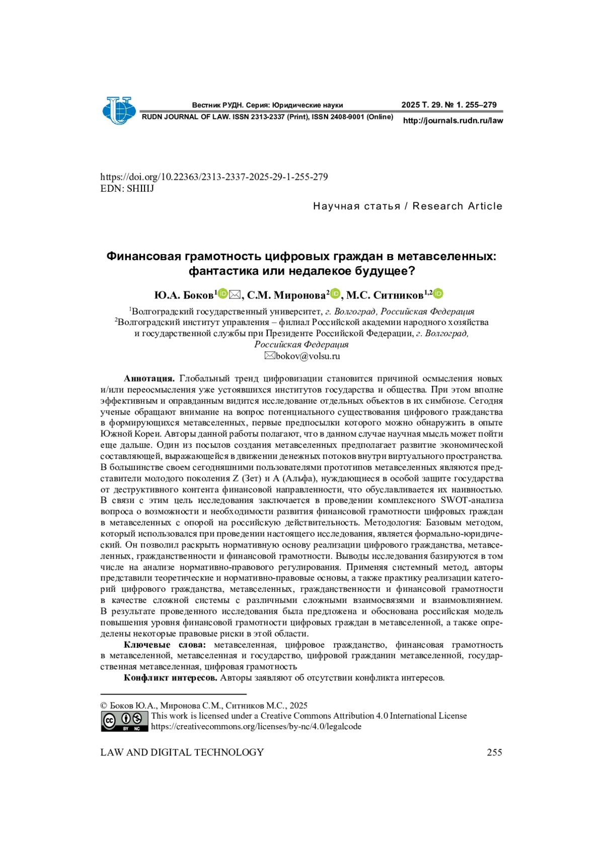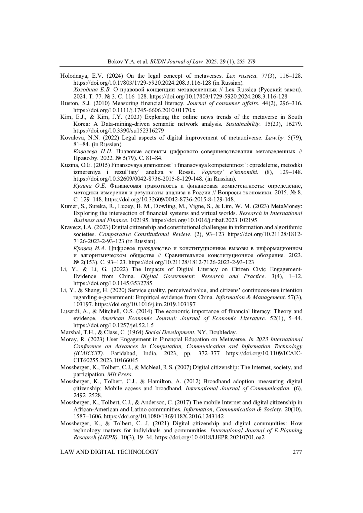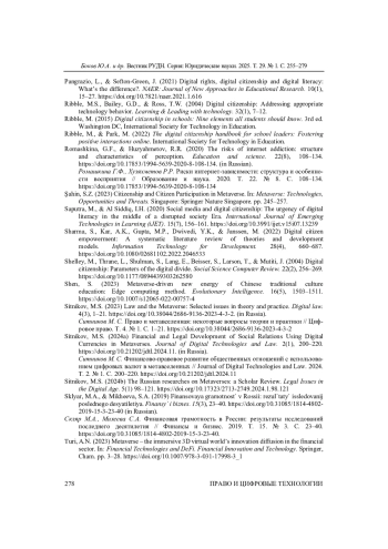 40. Sitnikov, M.S. (2024a) Financial and Legal Development of Social Relations Using Digital Currencies in Metaverses. Journal of Digital Technologies and Law. 2(1), 200-220. 10.21202/jdtl.2024.11. (in Russia). DOI: 10.21202/jdtl.2024.11.(inRussia) EDN: YXCJNO