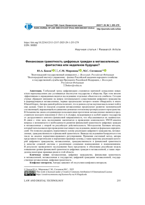 Глобальный тренд цифровизации становится причиной осмысления новых и/или переосмысления уже устоявшихся институтов государства и общества. При этом вполне эффективным и оправданным видится исследование отдельных объектов в их симбиозе. Сегодня ученые обращают внимание на вопрос потенциального существования цифрового гражданства в формирующихся метавселенных, первые предпосылки которого можно обнаружить в опыте Южной Кореи. Авторы данной работы полагают, что в данном случае научная мысль может пойти еще дальше. Один из посылов создания метавселенных предполагает развитие экономической составляющей, выражающейся в движении денежных потоков внутри виртуального пространства. В большинстве своем сегодняшними пользователями прототипов метавселенных являются представители молодого поколения Z (Зет) и А (Альфа), нуждающиеся в особой защите государства от деструктивного контента финансовой направленности, что обуславливается их наивностью. В связи с этим цель исследования заключается в проведении комплексного SWOT-анализа вопроса о возможности и необходимости развития финансовой грамотности цифровых граждан в метавселенных с опорой на российскую действительность. Методология: Базовым методом, который использовался при проведении настоящего исследования, является формально-юридический. Он позволил раскрыть нормативную основу реализации цифрового гражданства, метавселенных, гражданственности и финансовой грамотности. Выводы исследования базируются в том числе на анализе нормативно-правового регулирования. Применяя системный метод, авторы представили теоретические и нормативно-правовые основы, а также практику реализации категорий цифрового гражданства, метавселенных, гражданственности и финансовой грамотности в качестве сложной системы с различными сложными взаимосвязями и взаимовлиянием. В результате проведенного исследования была предложена и обоснована российская модель повышения уровня финансовой грамотности цифровых граждан в метавселенной, а также определены некоторые правовые риски в этой области.