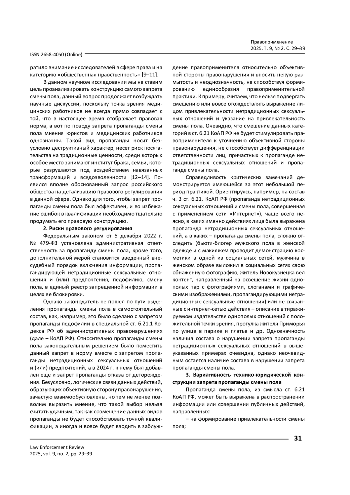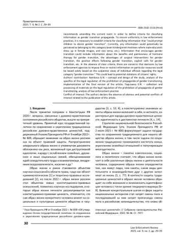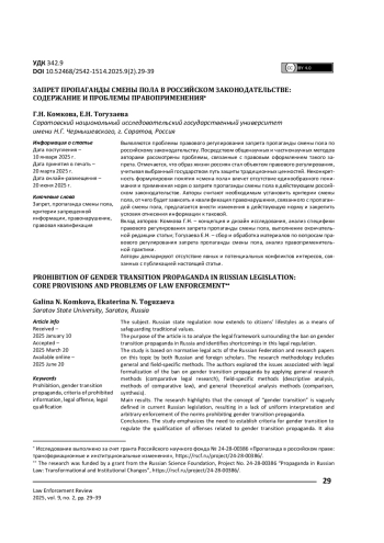 Выявляются проблемы правового регулирования запрета пропаганды смены пола по российскому законодательству. Посредством общенаучных и частнонаучных методов авторами рассмотрены проблемы, связанные с правовым оформлением такого запрета. Отмечается, что образ жизни россиян стал объектом правового регулирования, учитывая выбранный государством путь защиты традиционных ценностей. Неконкретность формулировки понятия «смена пола» влечет отсутствие единообразного понимания и применения норм о запрете пропаганды смены пола в действующем российском законодательстве. Авторы считают необходимым установить критерии смены пола, от чего будет зависеть и квалификация правонарушения, связанного с пропагандой смены пола, предлагается внести изменения в действующую норму и закрепить условия отнесения информации к таковой.