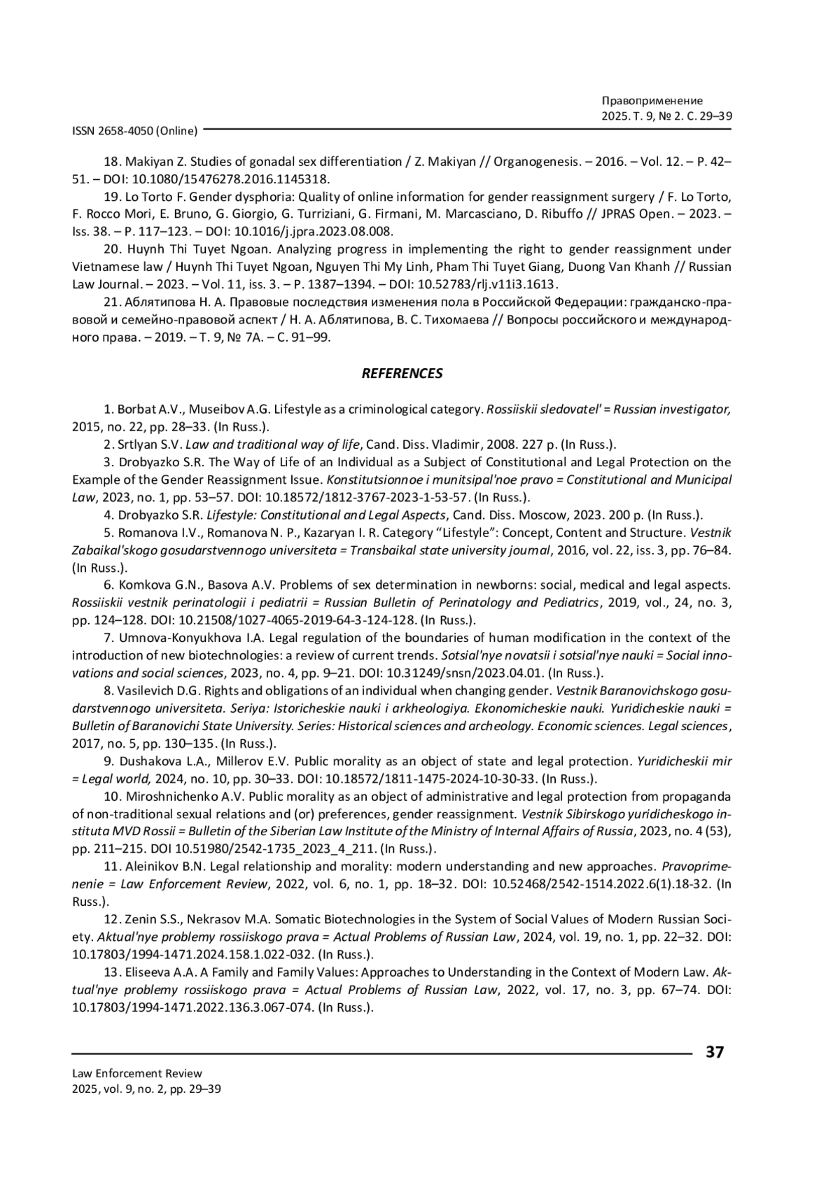 3. Дробязко С. Р. Образ жизни личности как предмет конституционно-правовой защиты на примере вопроса о смене пола / С. Р. Дробязко // Конституционное и муниципальное право. - 2023. - № 1. - С. 53-57. - https://doi.org/10.18572/1812-3767-2023-1-53-57.